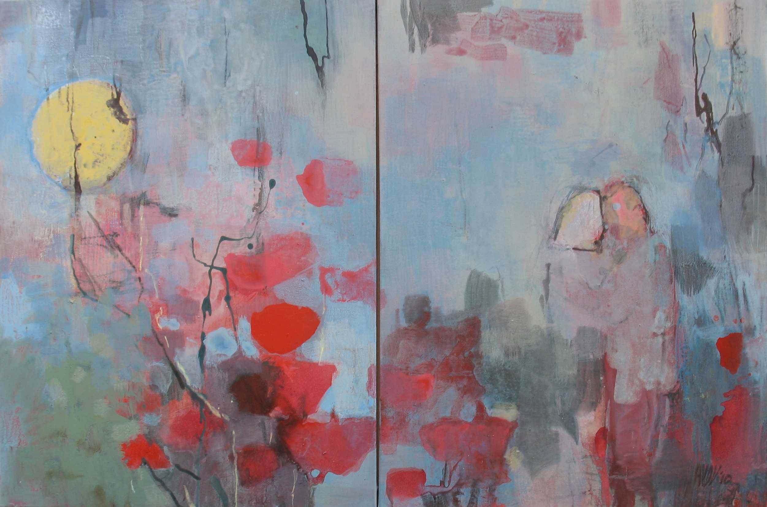 Mijn schilderijen gaan over vergankelijkheid,bomen, weerspiegelingen, zee- en landschappen en bloemvormen. Ik schilder met acrylverf maar gebruik ook collage, inkt, papier, marmerpoeder en zand.