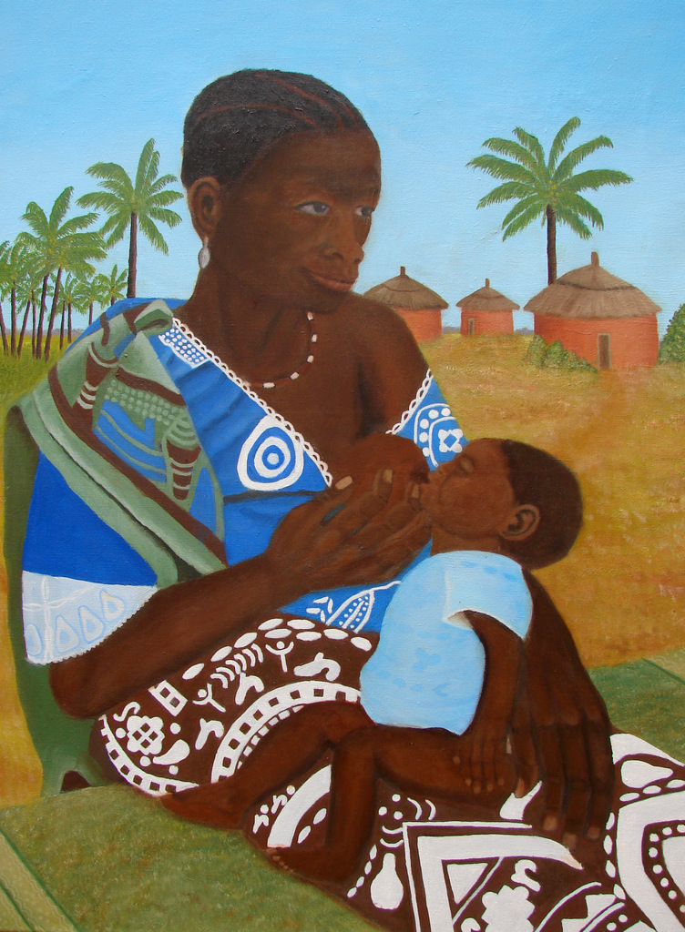 In dit schilderij wordt een zogende moeder afgebeeld gekleed in traditionele kleding met op de achtergrond een indruk van het landschap.