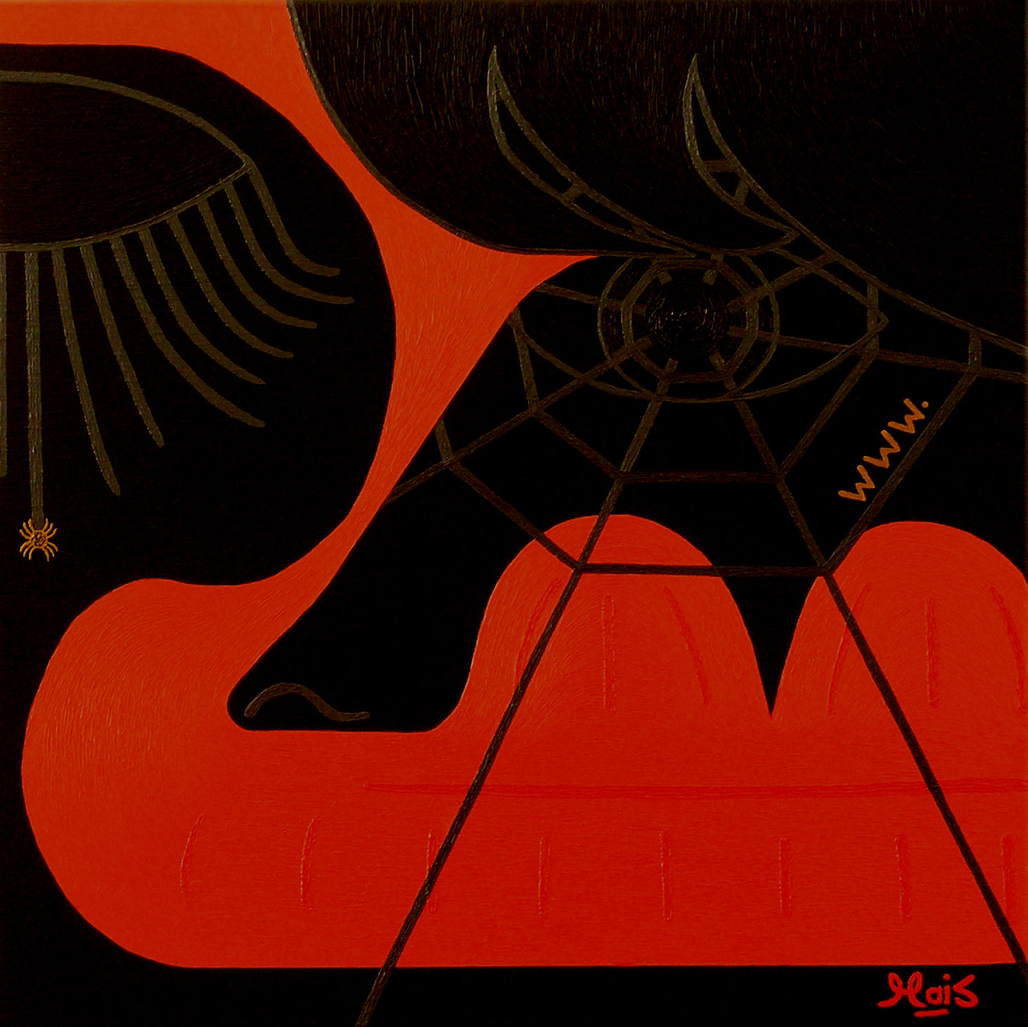 De mens spint zichzelf in het (ww)web. Uit de "Lips" serie. O.a. dit werk was te zien in La Galleria Pall Mall in Londen (maart 2011).