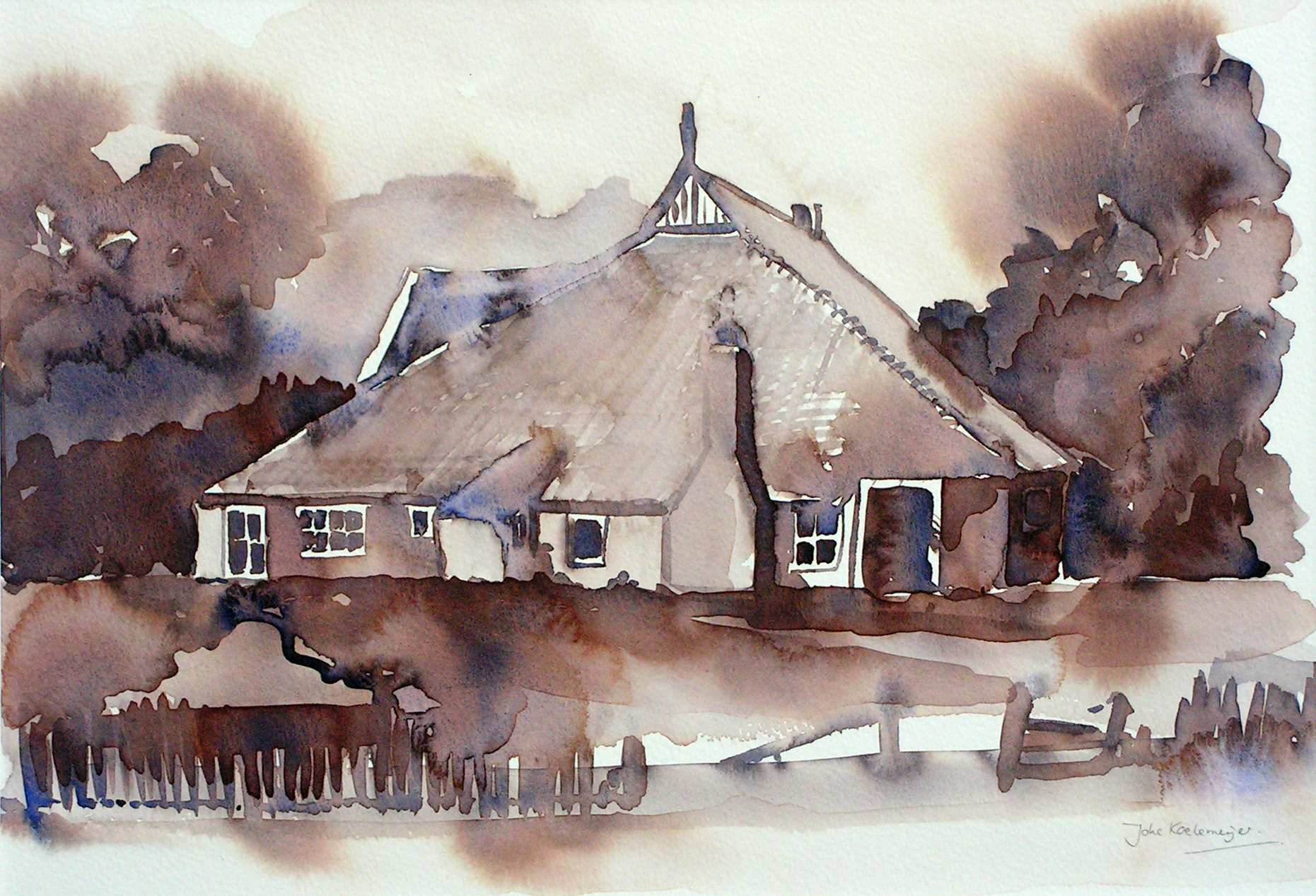 Huis Blauw Bruin Blue Tuin Aquarel Realistisch Brown Hek Boerderij Farm House Garden Terschelling Realistic Watercolour Monochroom Fence Sil Strandjutter Monochromatic