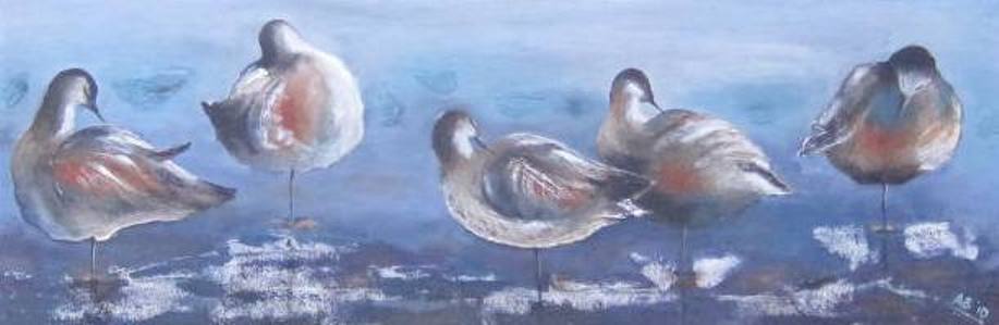Doek met 3-D effecten, zand en grof opgezet gesso zijn erin verwerkt. Ik heb een eigen draai gegeven aan de oorspronkelijke fuut...