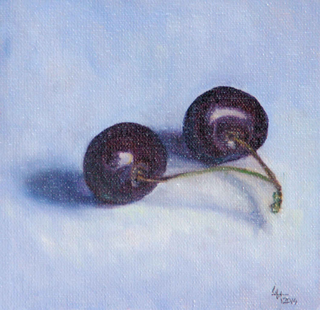 Stilleven van kersen, 10x10 cm. Verkocht.