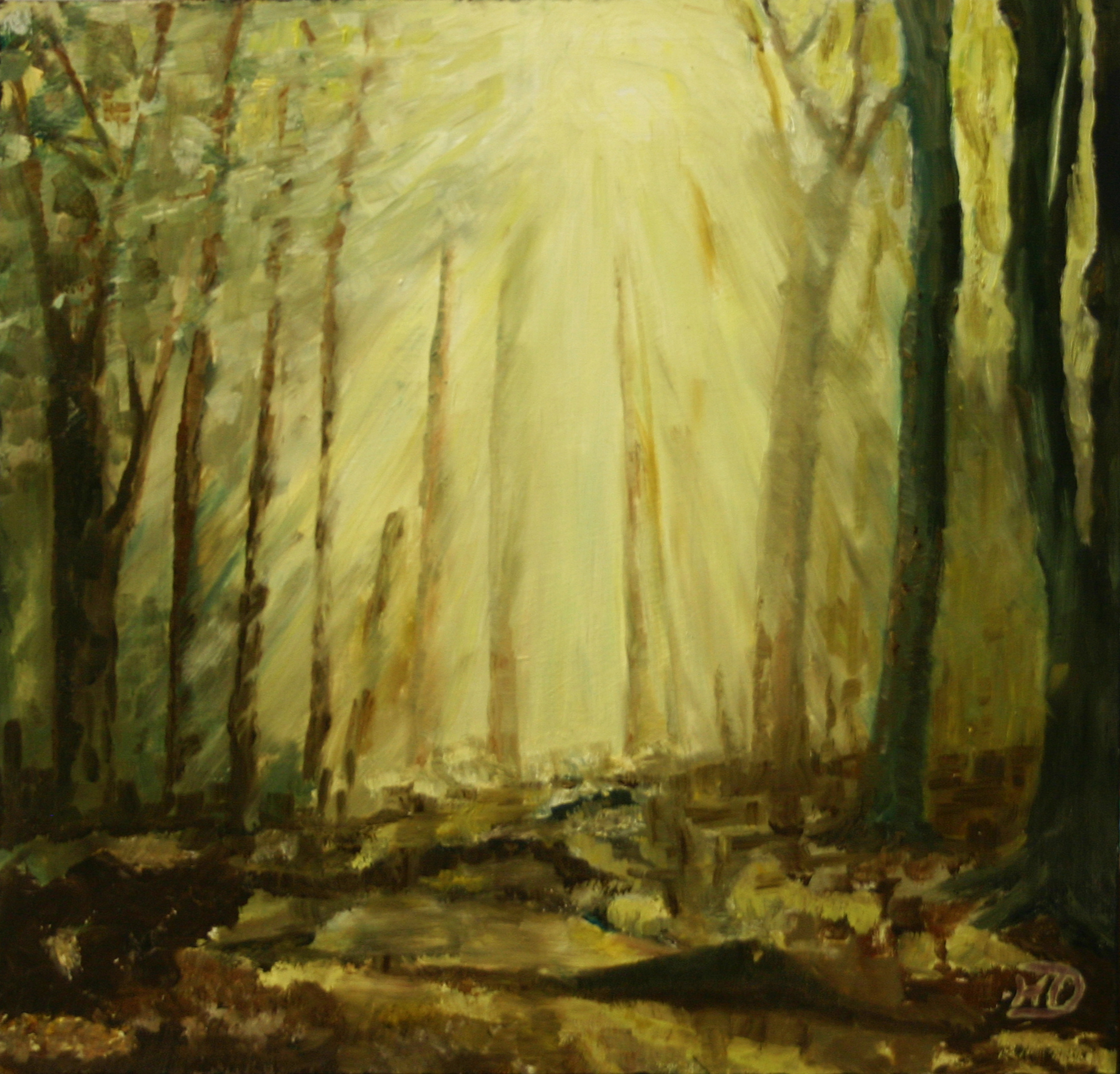 Een zoninval in de gelderse bossen, geschilderd op paneel in olie, gebruikmakend van het kleurenpalet van Luc Tuijmans