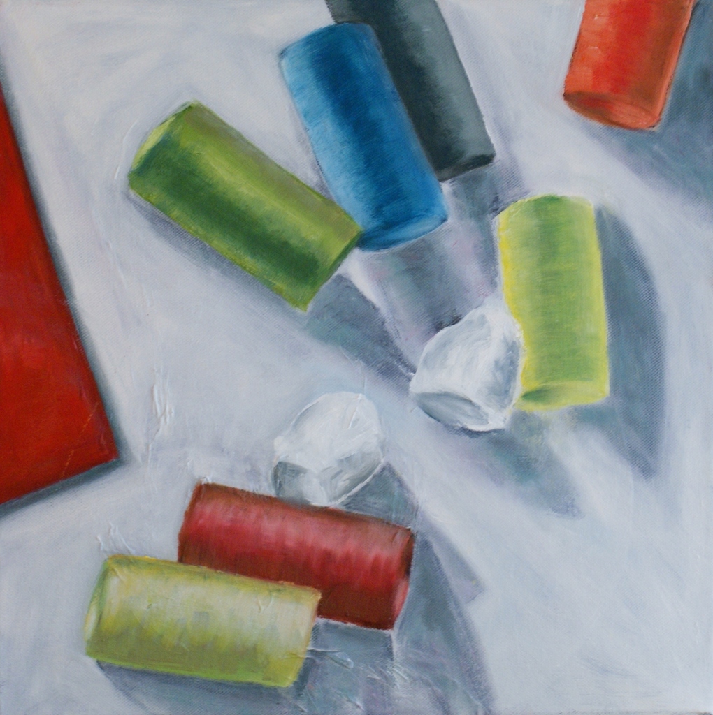 Stilleven gemaakt van bovenaf, veel schaduw en door de schaduwen krijg je dipte in het werk. De kleurtjes van de krijtjes geven het iets kleurigs.
