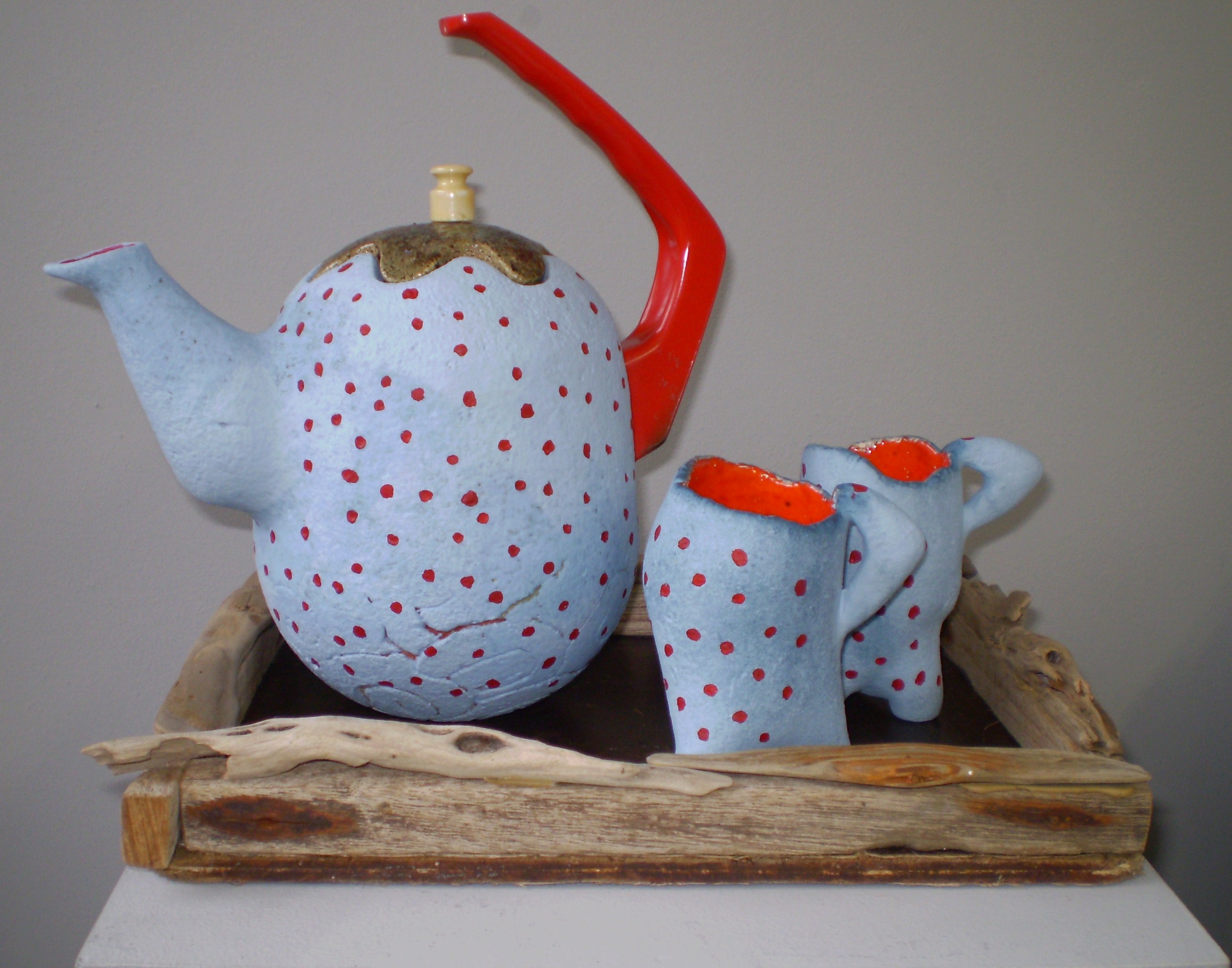 Theeservies op drijfhouten dienblad. Bewerkt met engobes en glazuur.