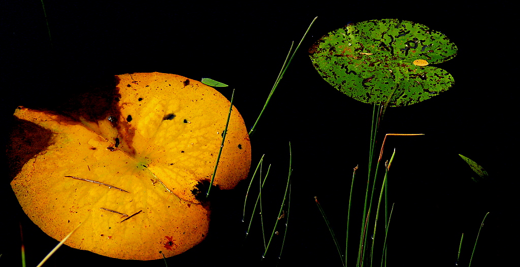 De herfst is al vroeg gekomen en kleurt het waterlelieblad.