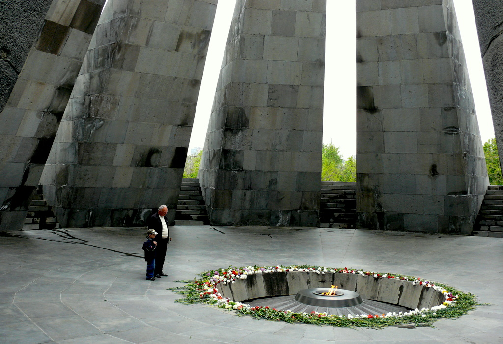 Vader met kind in het genocidemonument in Jeravan Armenië. Zomer 2010.