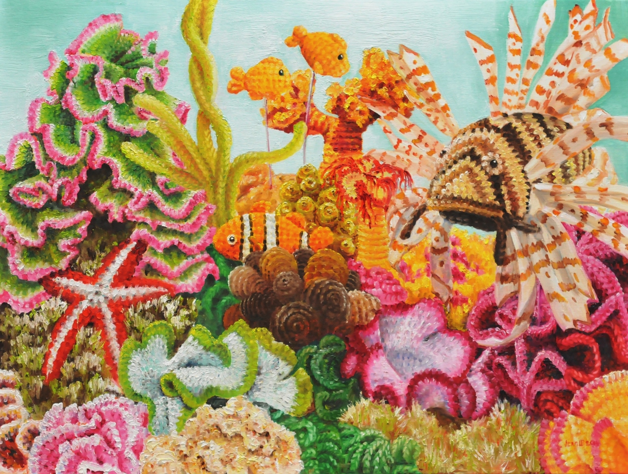 Dit werk brengt hulde aan de talloze mensen die zich hebben ingezet om het verdwijnen van de koraalriffen onder de aandacht te brengen door met eindeloos geduld koraalriffe te haken. Het schilderij is vervaardigd in hoogkwalitatieve olieverf op Vlaams linnen.