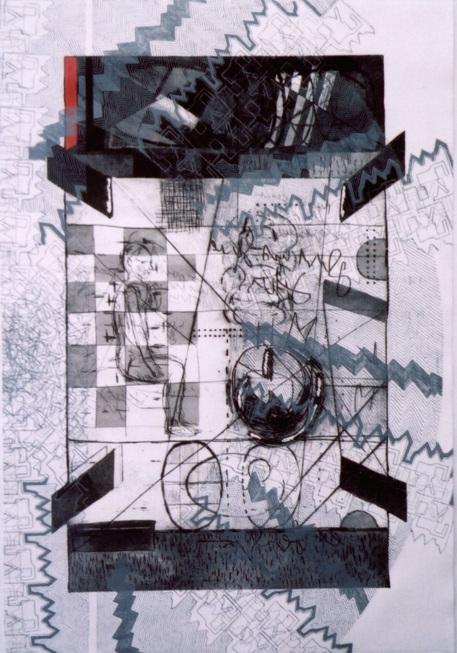 Opvallend in deze prent zijn de ritmische patronen, de helderheid en transparante gelaagdheid.