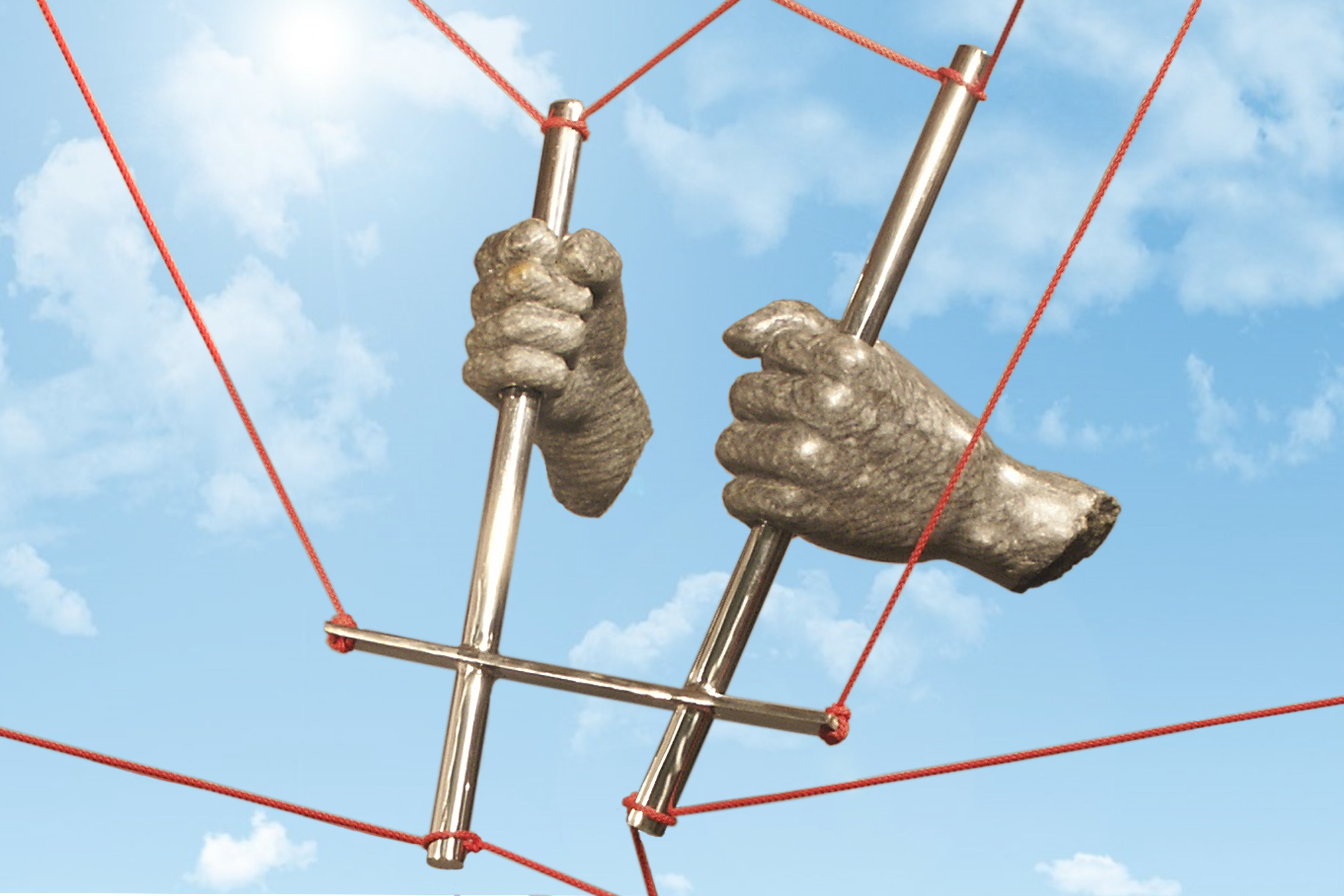 Handen achter tralies gevangen in een web.