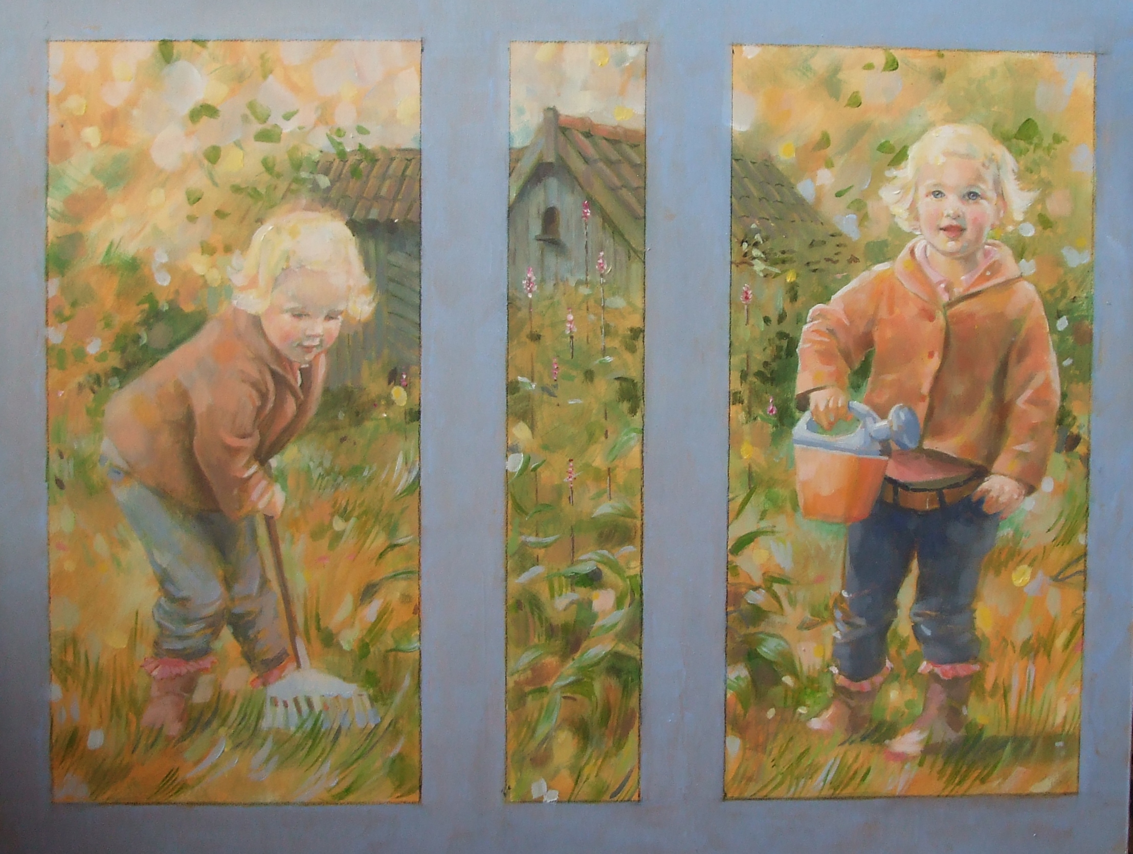 Het meisje Isabelle is bezig in de tuin van haar oma Bernadette. Ik heb gekozen voor een drieluik omdat ik daarmee de dynamiek van het gebeuren beter kon vastleggen. Deze opdracht voltooide ik in november 2010.