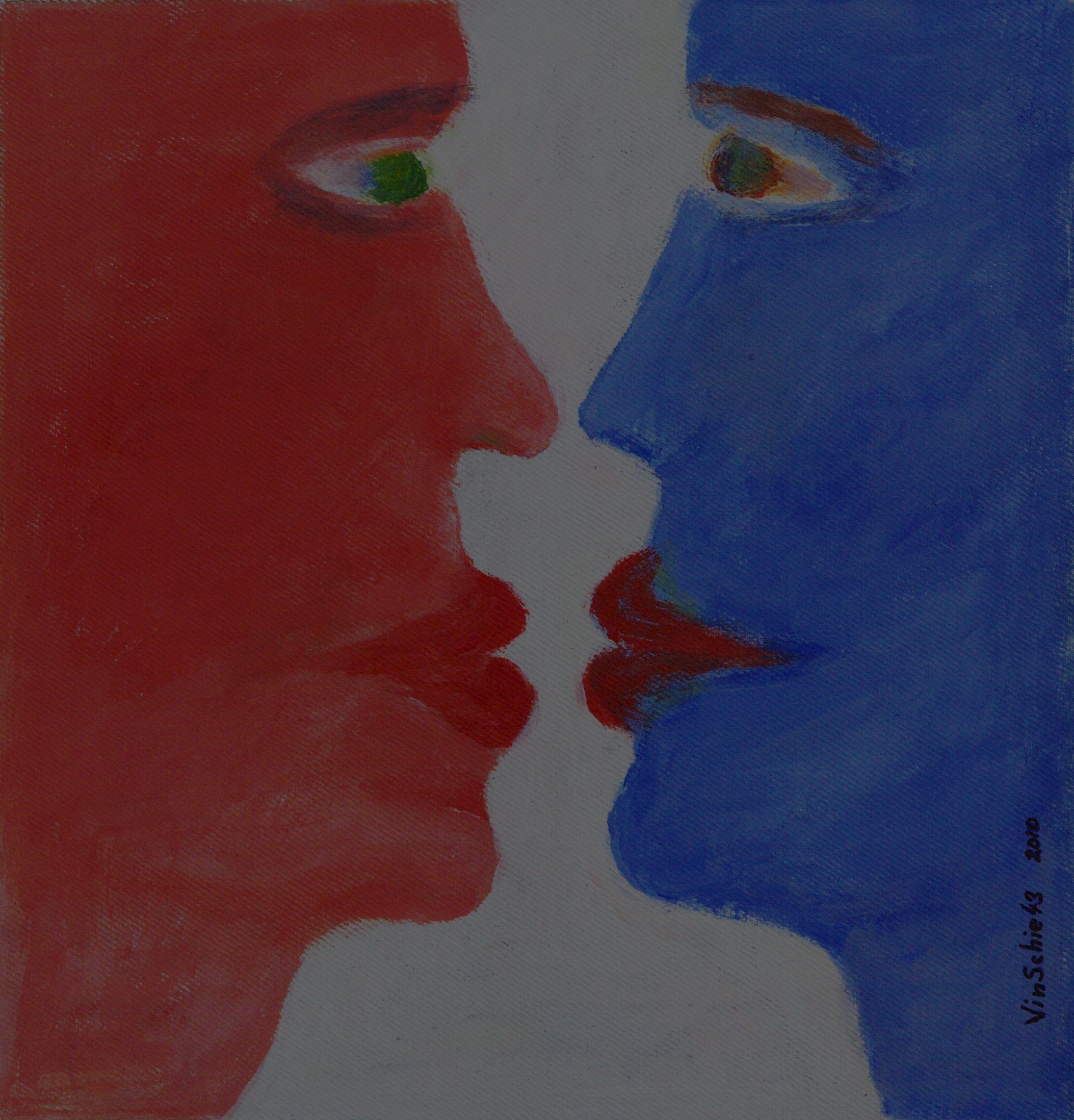 Elkaar als mens konfronteren of juist een toenadering zoeken. Als werk gegeven voor het Warchild doel. Achterkant van dubbelwerk.