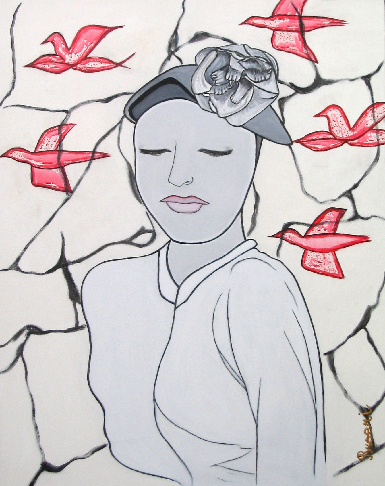 Een figuratief abstraherend schilderij. Zwart wit met een vleugje rood.
