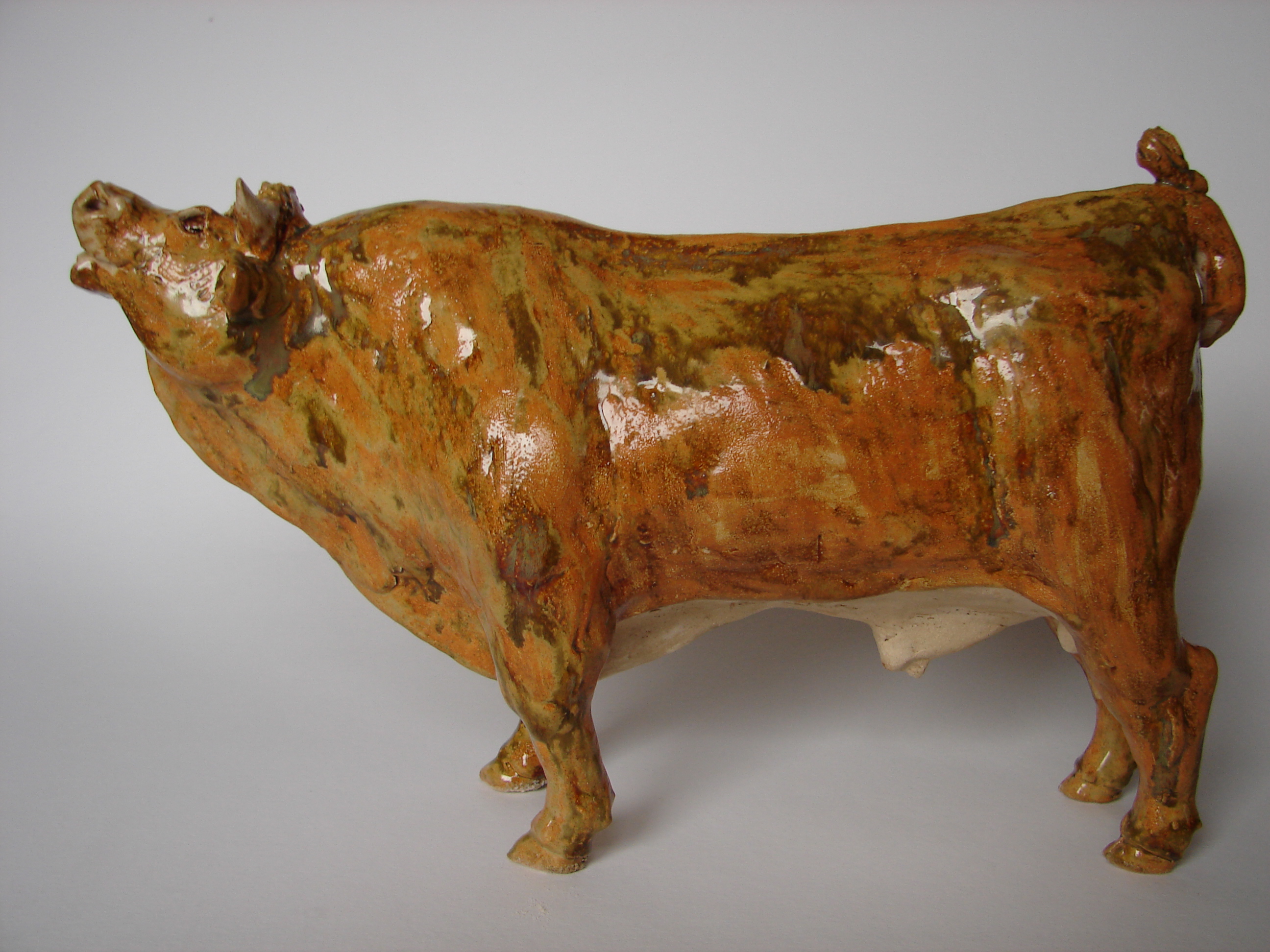 Deze loeiende stier is handgebouwd uit een menging van steengoedklei en porseleinklei. Hij is helemaal hol, van staart tot open neusgaten. Zijn achterste heeft een open spleet, zodat hij als spaarpot gebruikt kan worden