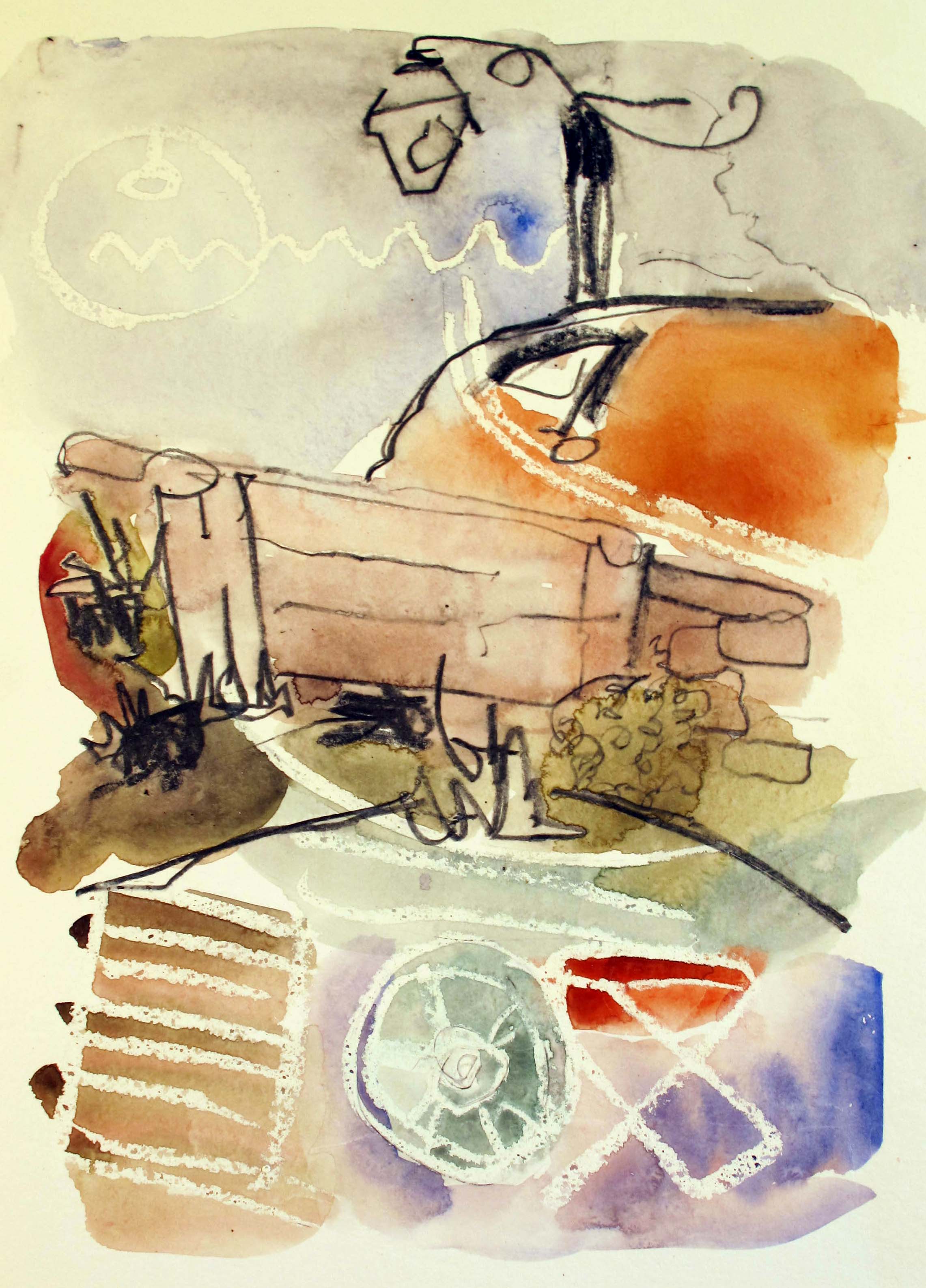 Natuur Boerderij Farm Machine Schuur Installatie Nature Barn Installation Machinery Mixed Media Drawing Pencil Potlood Oliepastel Oilpastel