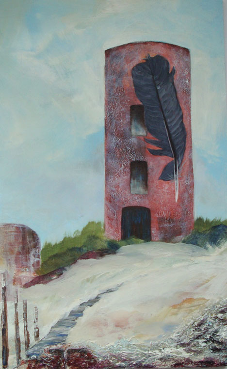 Gemengde Techniek: Toren Vuurtoren Veer Veertoren Natuur Landschap Grijs Blauw Oker Wad Strand Eiland Terschelling Ameland Acryl Mixed-media Techniek