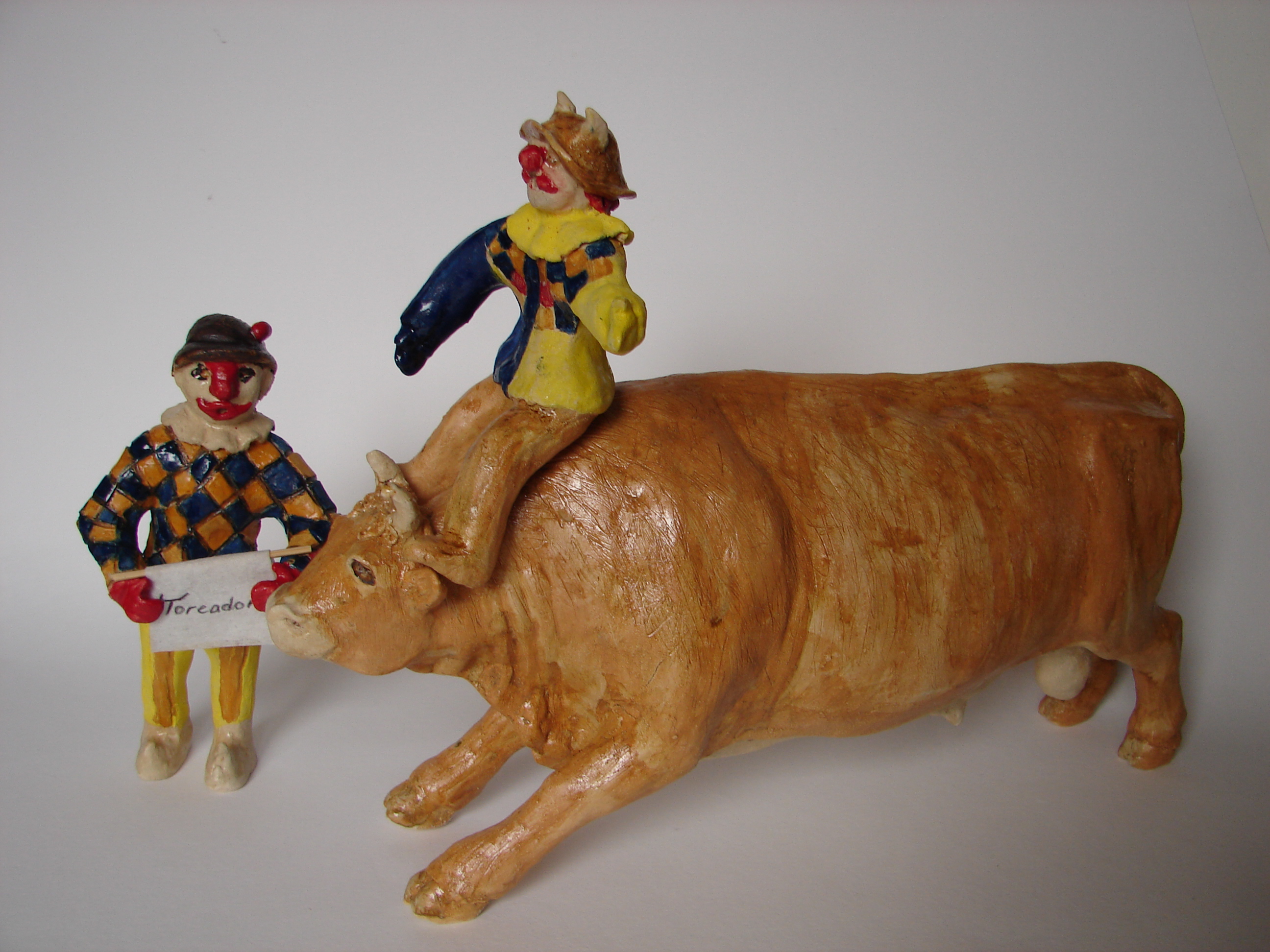 Tijdens het Costaricaanse stierengevecht zijn de clowns de toreadors die alleen maar plezier maken, terwijl de stier na een tijdje zelfstandig de ring weer verlaat. Handgebouwd, hol, uit een mengsel van steengoedklei en porseleinklei.