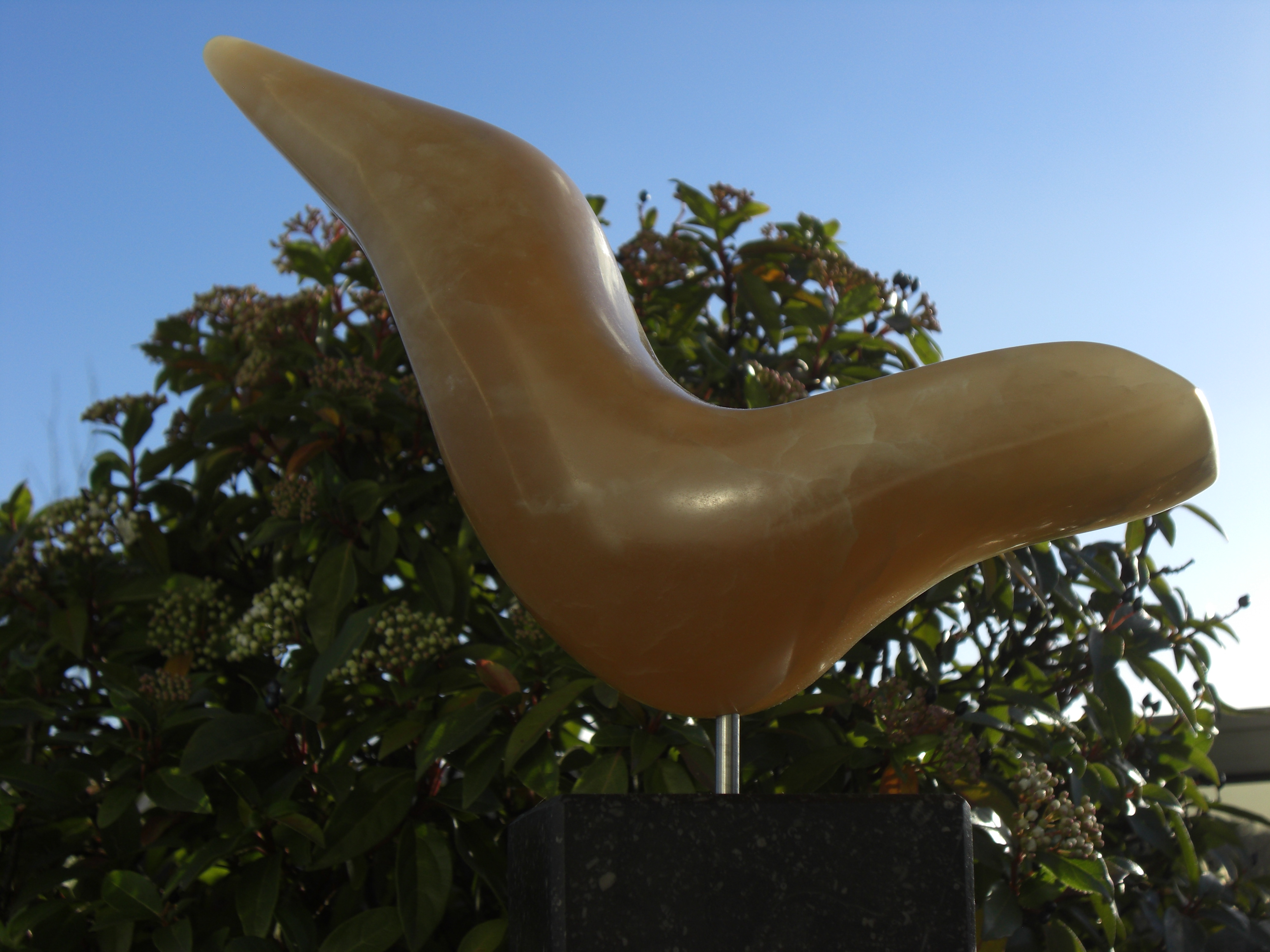 vogel in zijn vlucht uitgevoerdin honingkleurige albast