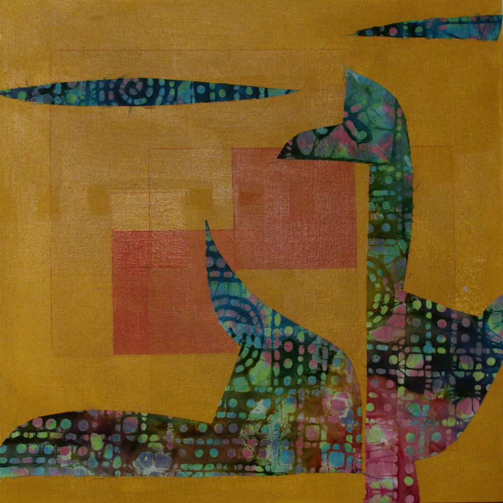 Gebatikte katoen op een beschilderde ondergrond (acryl op canvas). De overwinnaar staat fier, de verliezer ligt achterover.