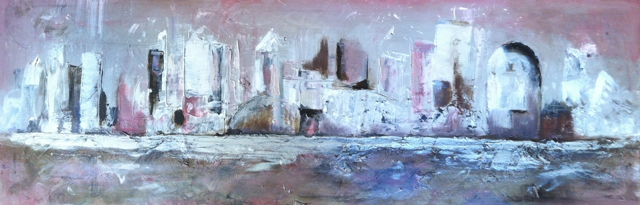 Skyline in gemengde technieken, mes, kwast, papier, zand.