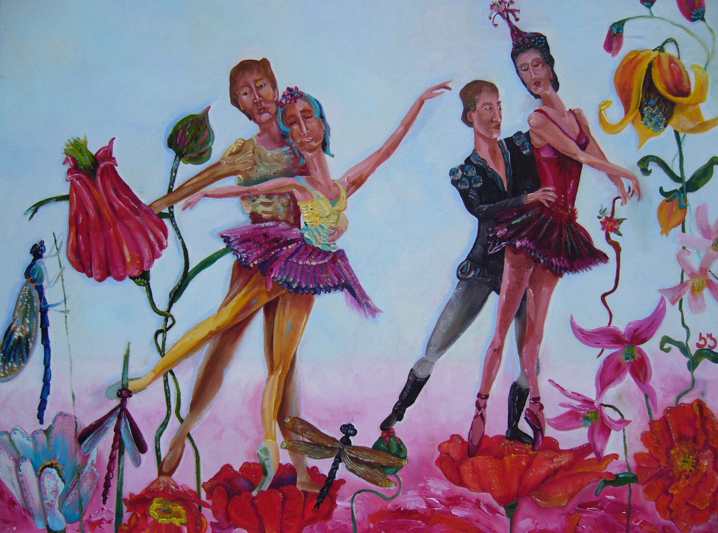 mislukt schilderij met ballerina's, dansend op bloemen, de lente begroetend. Ondanks het mislukken van het schilderij, heb ik bij het maken ervan ontzettend veel plezier mee gehad