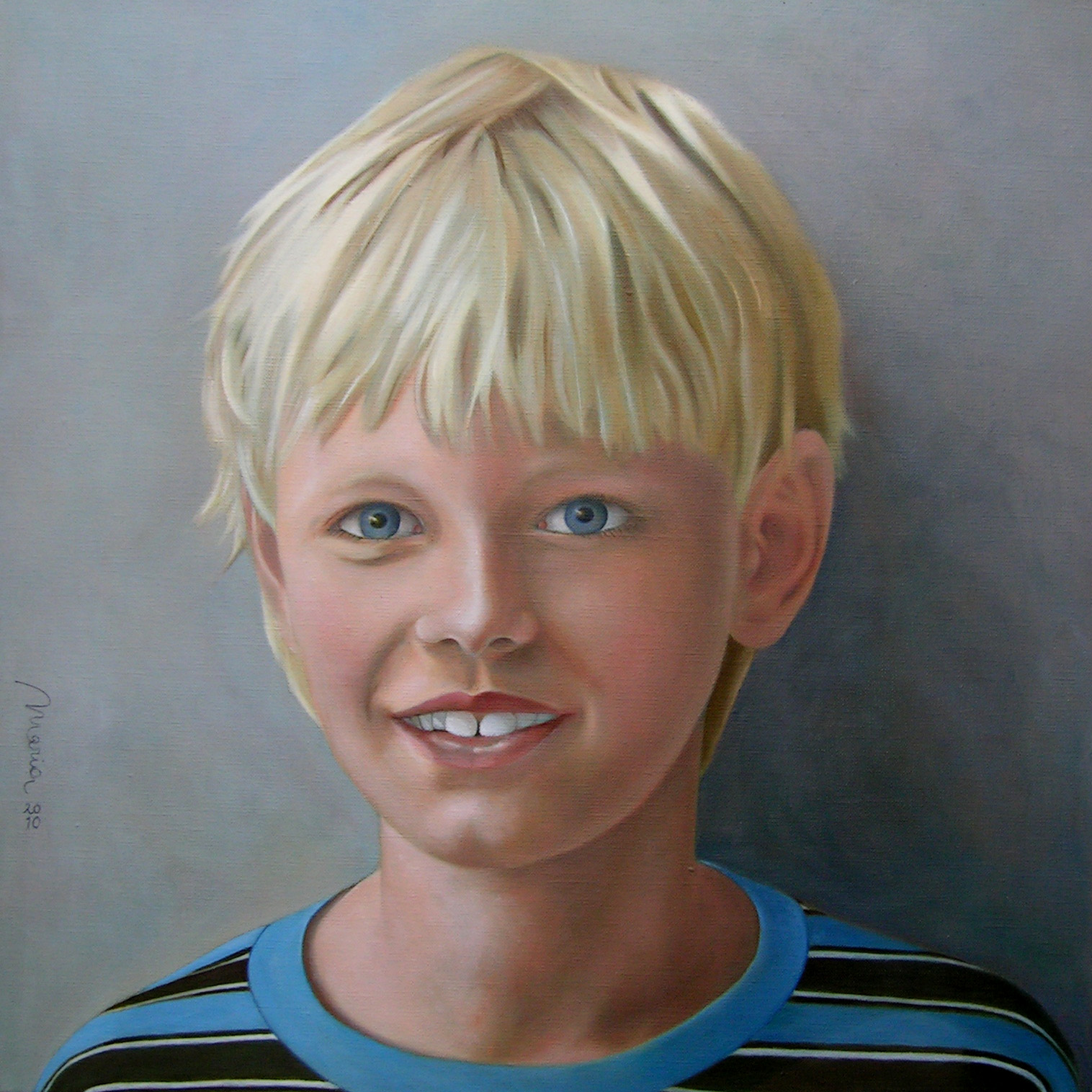 Blauw Kind Olieverf Jongen Blond Kinderportret Smile Traditioneel