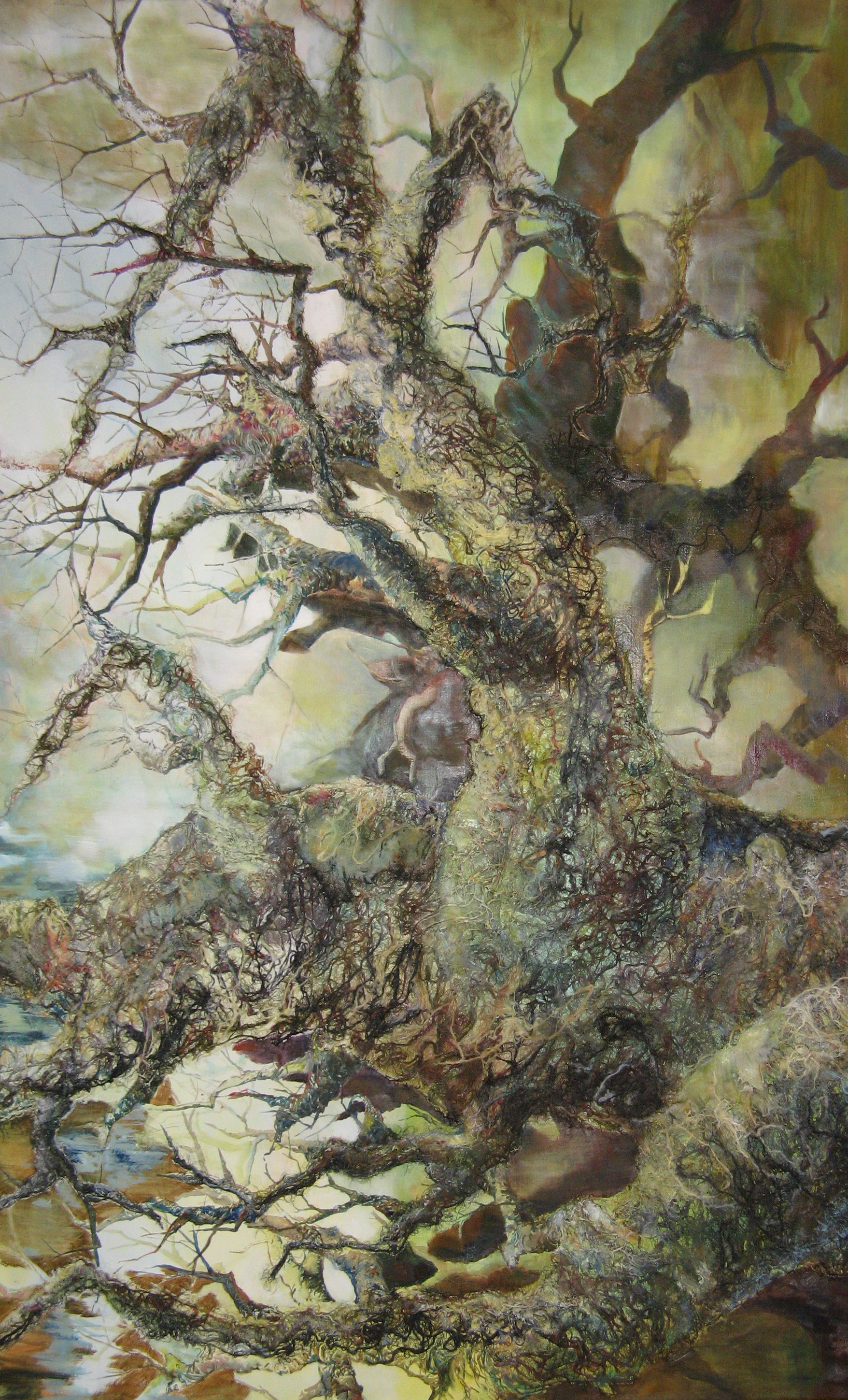Bomen als een monument, zo groot zo krachtig. Leuke bijkomstigheid het schlderij kan zowel horizontaal ( traditioneler) als vertikaal( spannender / mystereus) worden opgehangen.