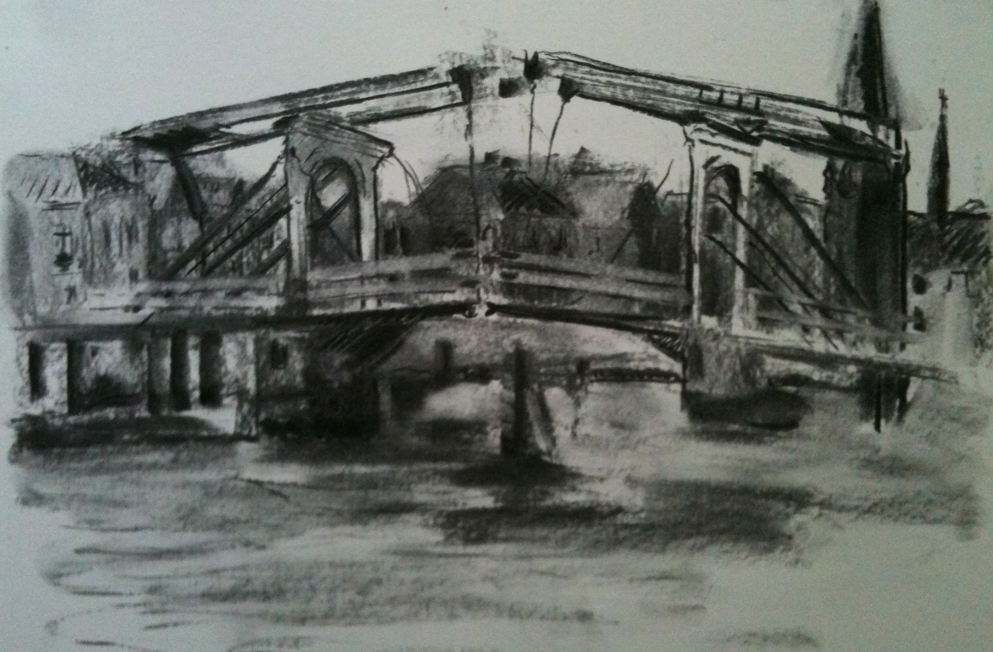 Papier Realistisch Houtskool Vecht Weesp Vechtbrug Tekening Brug Water Rivier