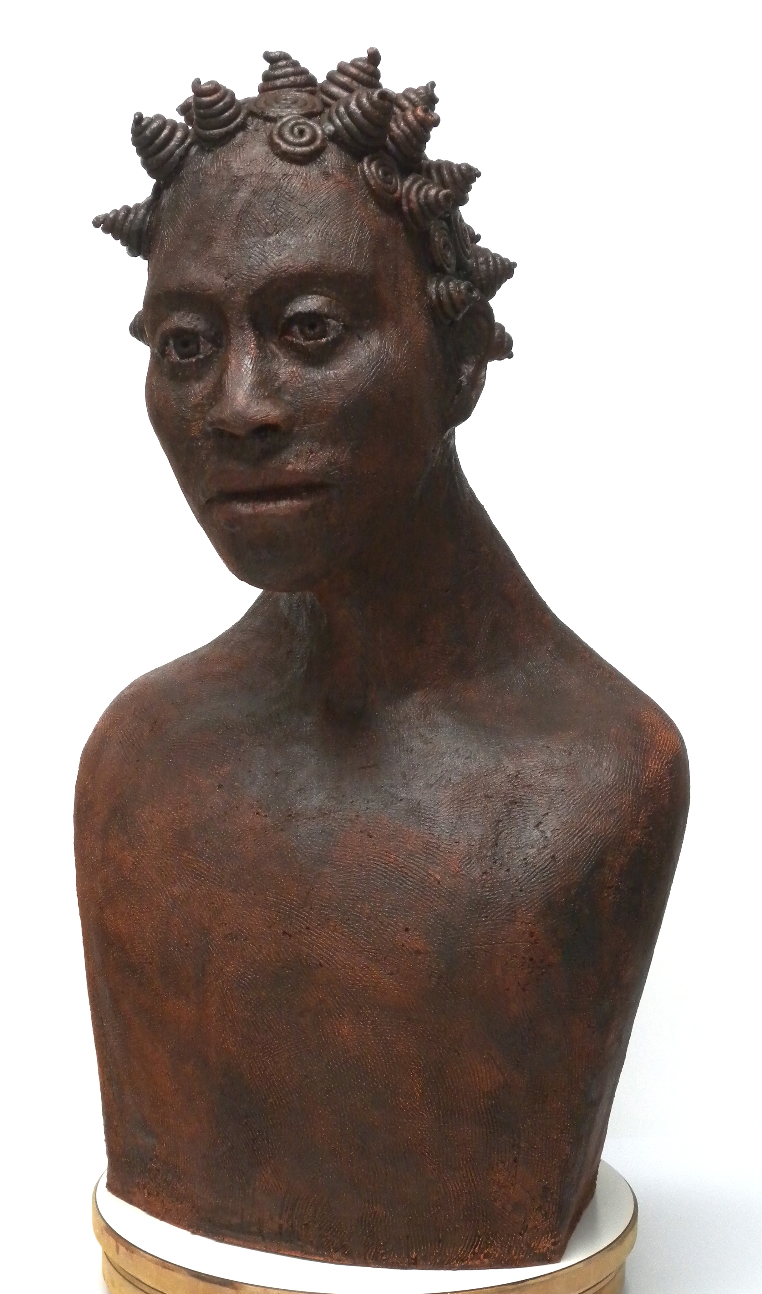 borstbeeld, portret van een donkere man met bijzonder haar steengoed, keramisch