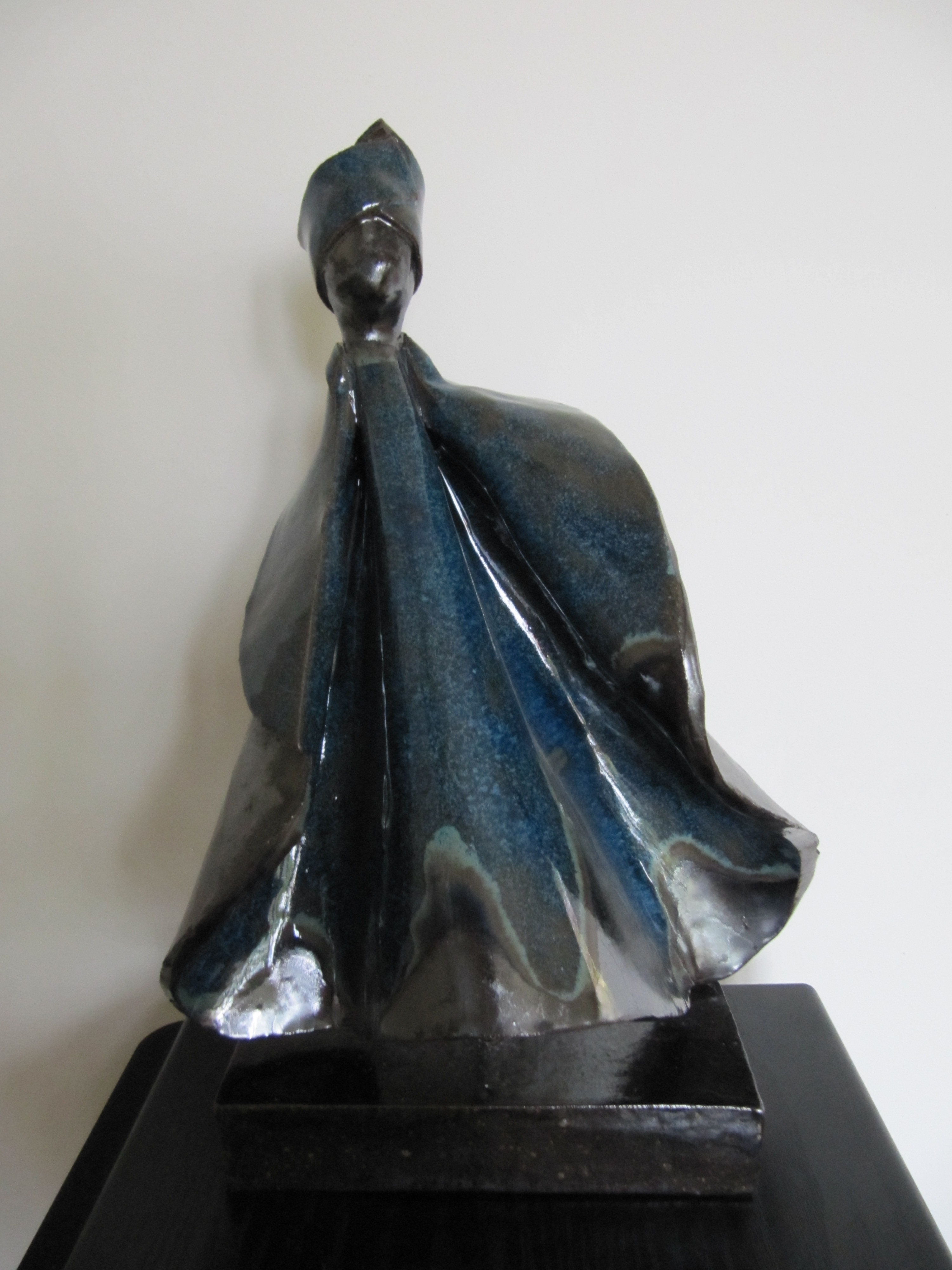 Vrouw in de wind op keramiek sokkel. Kleuren: Blauw effect en zwart spiegel.