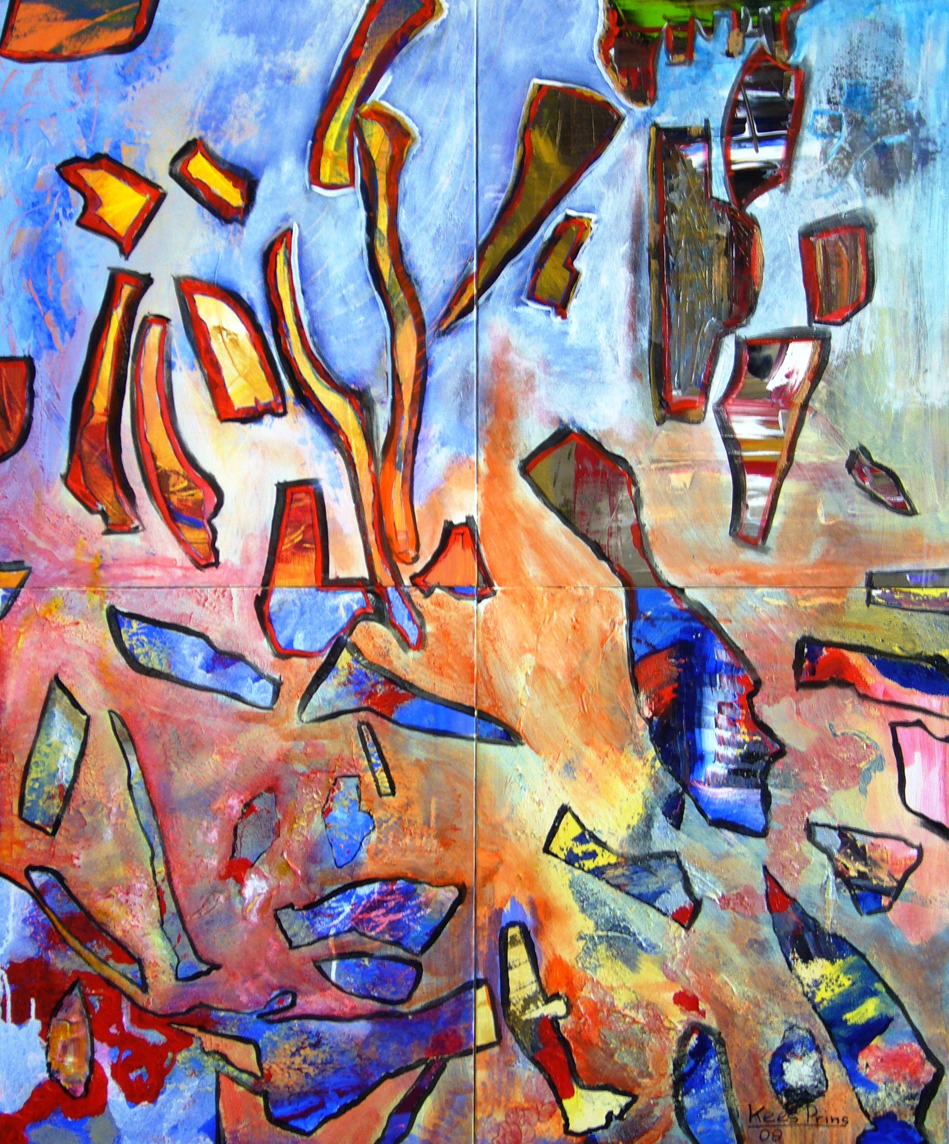 Ik had een workshop gegven aan een groep van 70 mensen van de politie academie en dan heb je er soms mensen bij die hun werk niet mee naar huis nemen. Ik heb vier van die werken aan elkaar geschroefd en deels afgeplakt met keukenkastjespapier. Vervolgens ben ik daaromheen zowel dekkend als transparant gaan schilderen. Na het verwijderen van het papier heb ik de ontstane vormen weer omkaderd en zo ontstond een toch heel sprankelend schilderij.Het is grappig hoe je zo doorkan gaan op het toeval van een ander