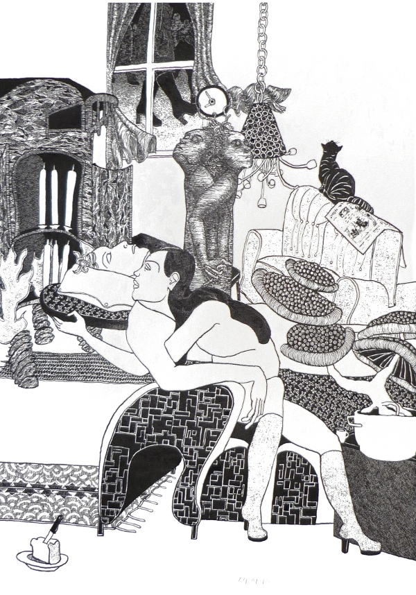 Ellen werkt met pen en inkt en tekent intieme, huislijke taferelen, die bij nader beschouwing vaak surrealistisch van aard zijn en toch óh zo herkenbaar. Haar tekeningen ontstaan geheel op intuïtieve wijze meteen in inkt op het papier, zonder plan of schets vooraf.