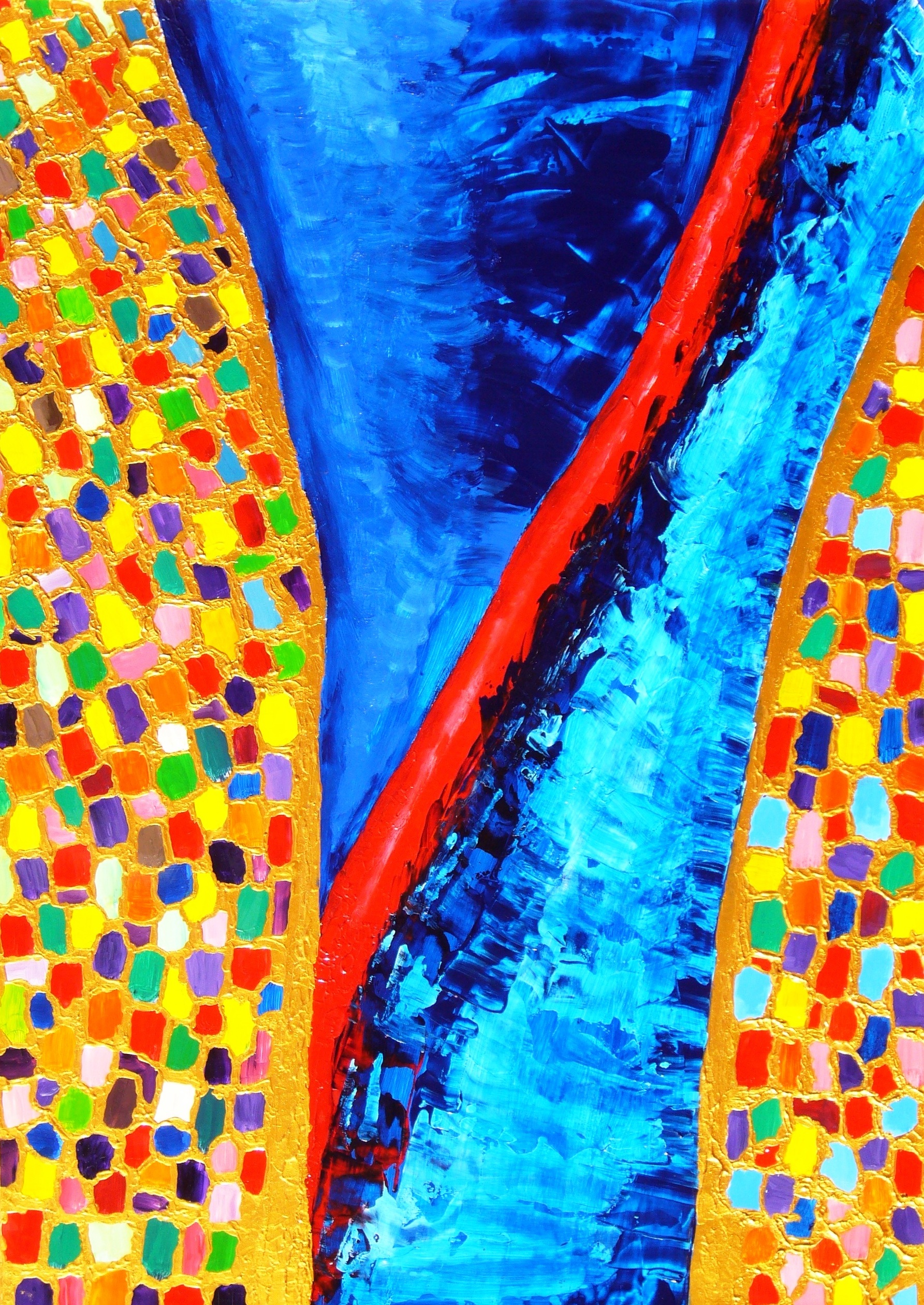 Ik was al een tijdje wild bezig met acryl en was om wat te oefenen begonnen met karton als ondergrond. Tot mijn eigen verbazing kwamen er al snel heel aantrekkelijke dingen uit voort. Maar het eerste schilderij in het nieuwe acryl avontuur waar ik zelf verbaasd stond van de kracht en de fascinatie was toch Gustav's vaas zoals ik het al snel noemde. Eigenlijk was het een beetje recalcitrant begonnen met gewoon wat kleurtjes los van elkaar op te brengen. Later bracht ik het goud er tussen in aan en na lang kijken en denken is het middenstuk met transparant blauw gekomen. Voor de spanning is de rode streep aangebracht. Ik had mij met de kleurtjes en het goud laten inspireren door Klimt vandaar de naam.
