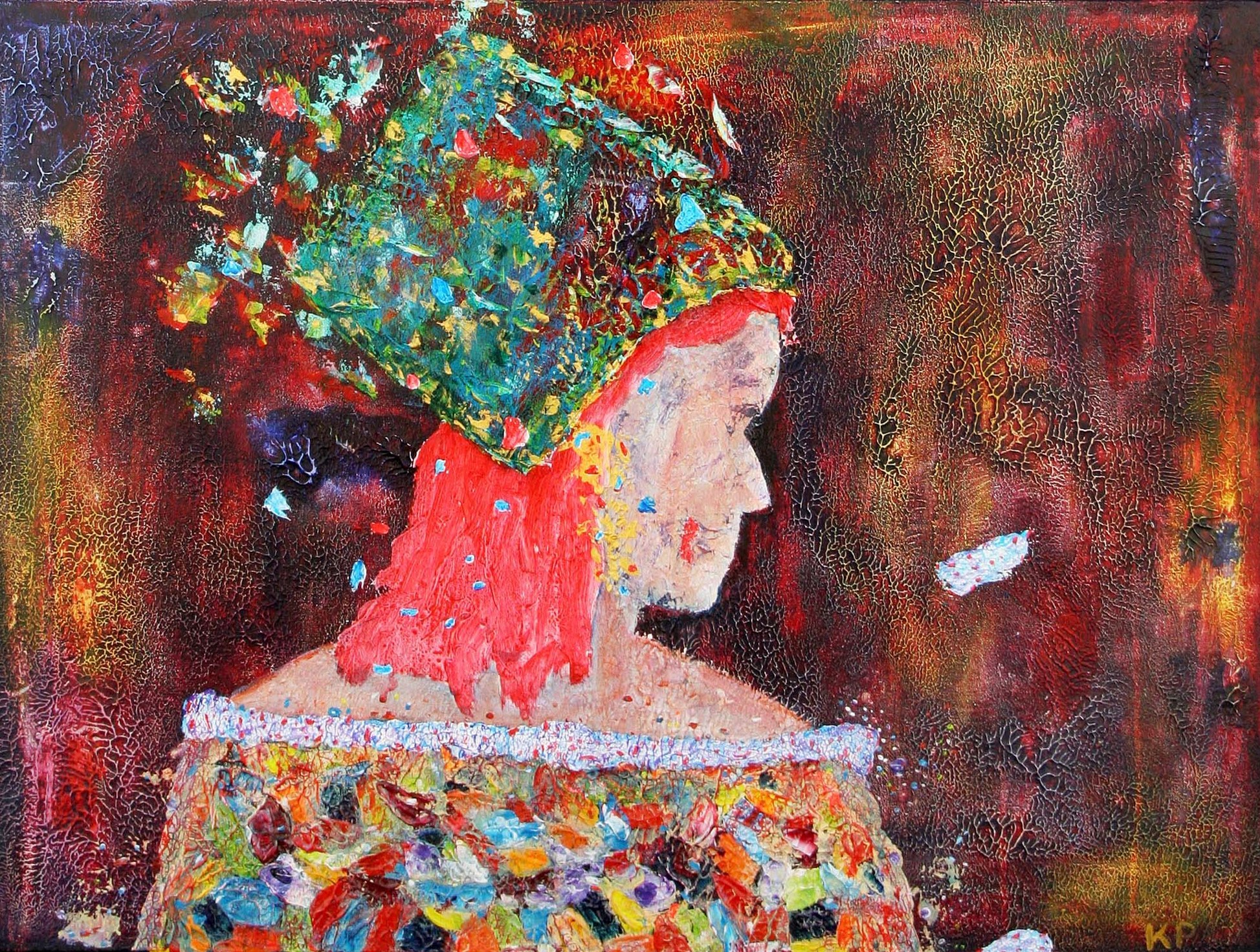 Dit is achteraf gezien samen met 'Lady in Red' Het eerste schilderij waarbij ik eerst met de ondergrond ban begonnen. Deze bestaat uit meerdere lagen die ik later weer heb opgeschuurd. Het is ook het eerste schilderij waarbij ik met heel dik opgebrachtte klodders verf naast elkaar heb gewerkt (in het lijfje) wat een heel sprankelend effect geeft. Ik heb de dames figuur bewust een beetje van achter opzij afgebeeld. Wat een heel vertederend effect geeft. Veel later realiseerde ik mij dat het een beetje hetzelfde idee is als bij het meisje met de parel van Vermeer. Haar hoed gaat een beetje over in de achtergrond.