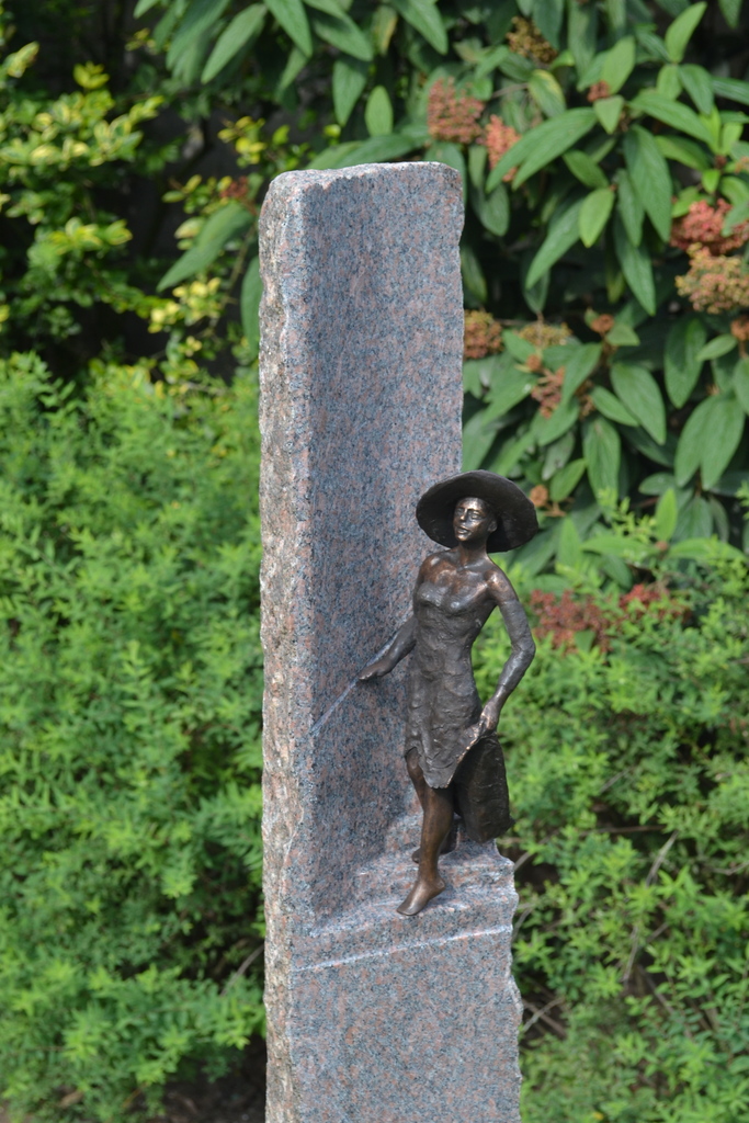 Eerste beeldje uit een serie van 10 verschillende tafereeltjes. (De rood granieten vergelijkbare zuilen maken de voorstelling tot een serie maar het zijn alle unieke afzonderlijke beeldjes voor binnen of buiten.) Het bronzen beeldje is 29 cm hoog