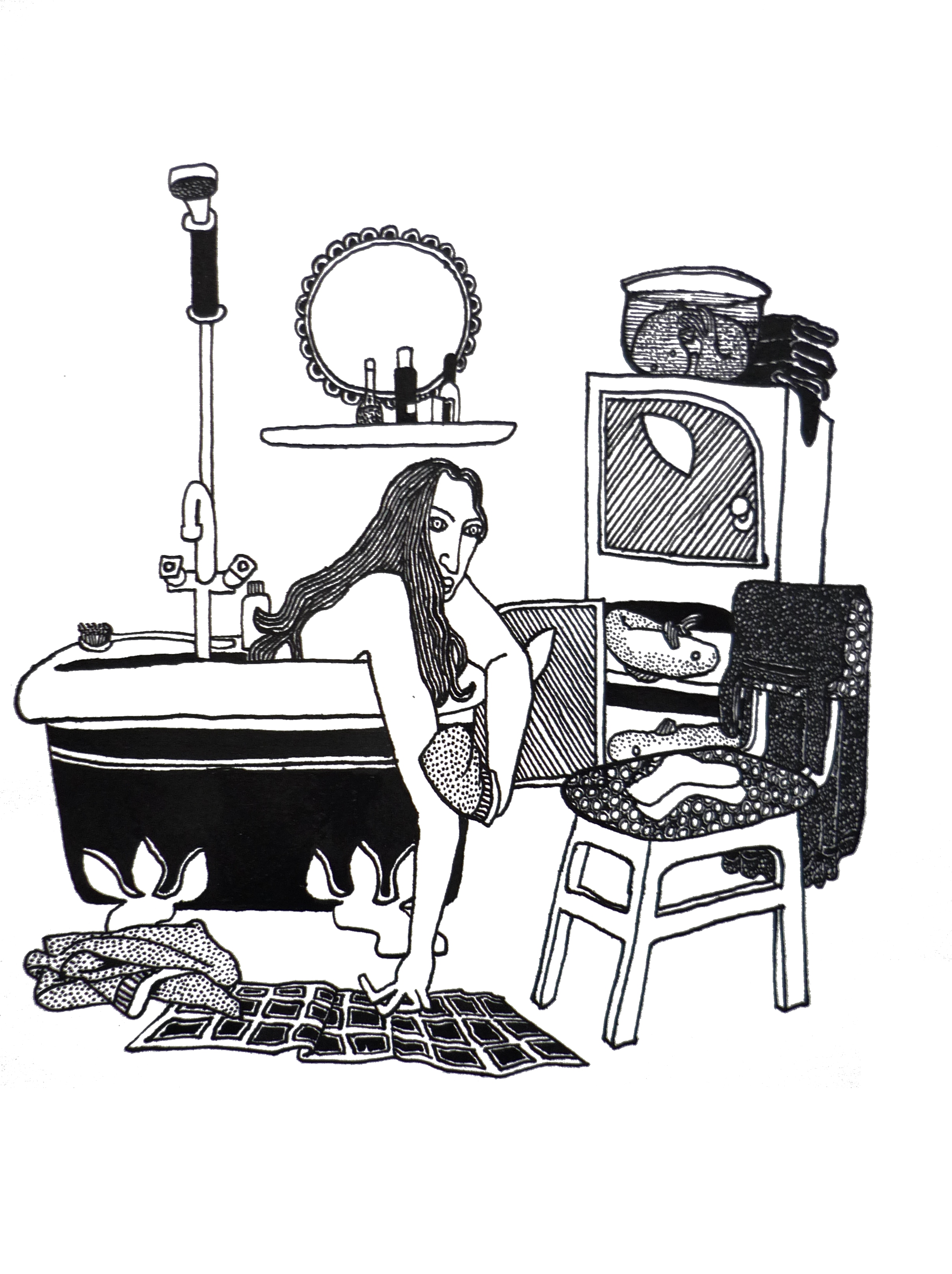 Ellen werkt met pen en inkt en tekent intieme, huislijke taferelen, die bij nader beschouwing vaak surrealistisch van aard zijn en toch óh zo herkenbaar. Haar tekeningen ontstaan geheel op intuïtieve wijze meteen in inkt op het papier, zonder plan of schets vooraf.