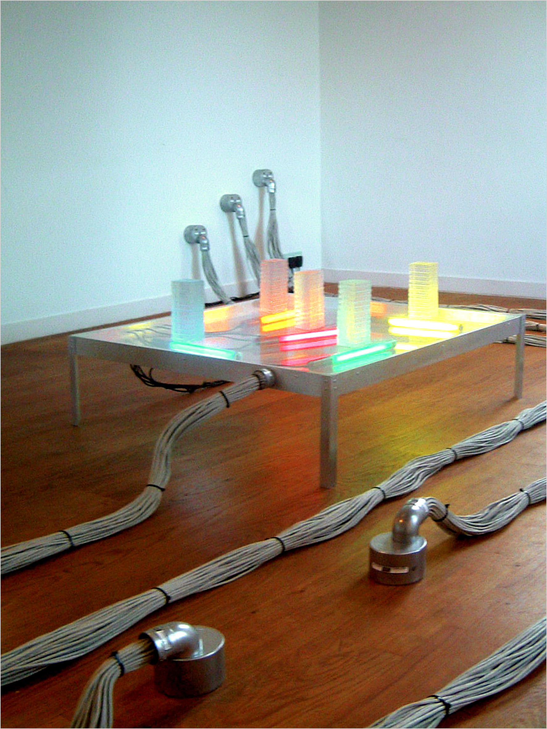 Lichtinstalatie gemaakt van verschillende materialen o.a.aluminuim, plexiglas, TL-licht, data kabel en acryl model gebouwen