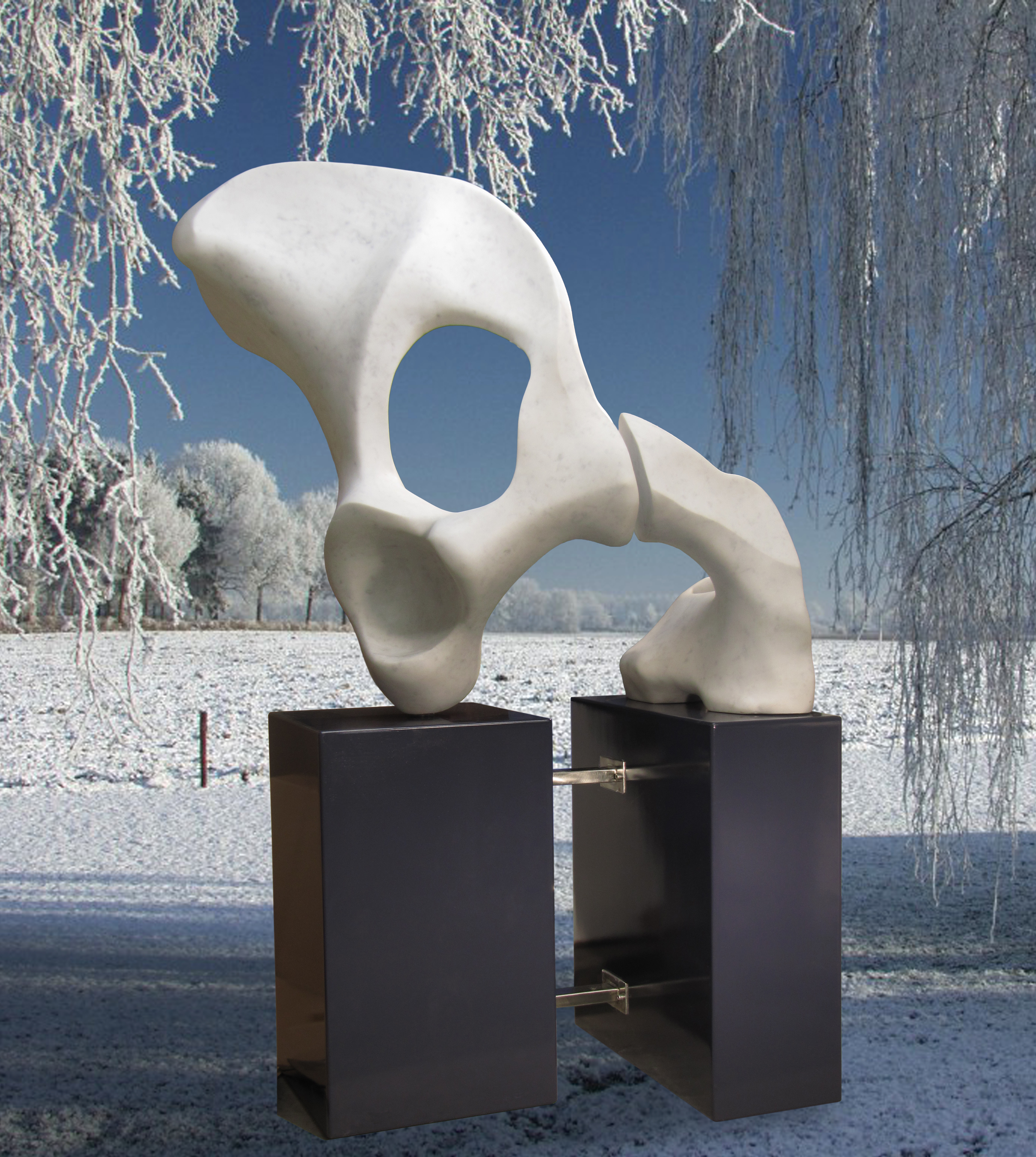 Twee stukken Cervaiola bianca marmer op twee sokkels verbonden met roestvast staal.