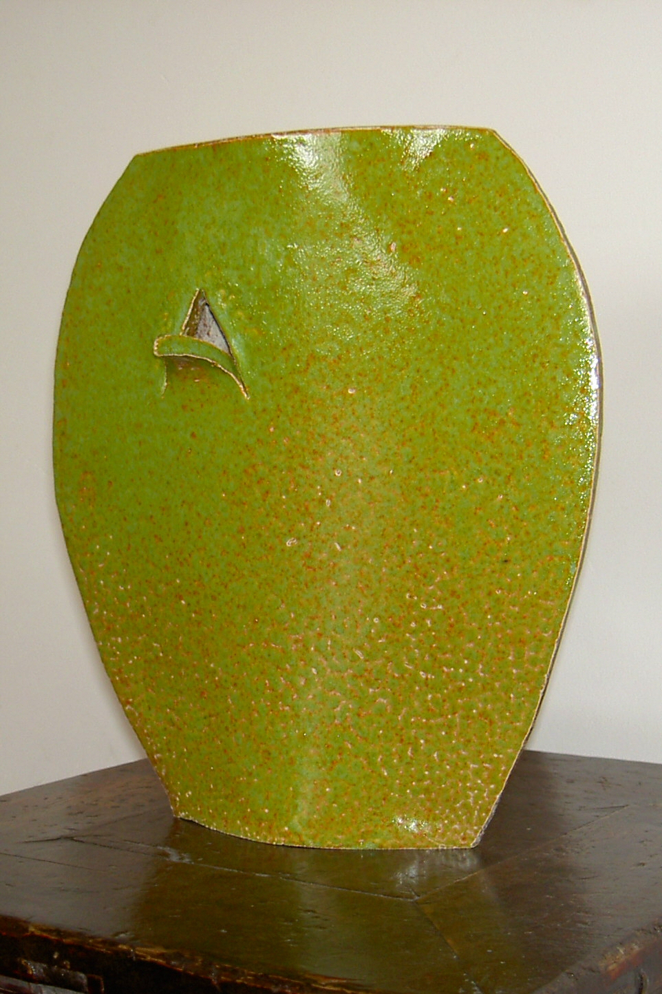 Deze felgroene vaas heeft een winkelhaak om de vlakke, strakke struktuur te doorbreken.