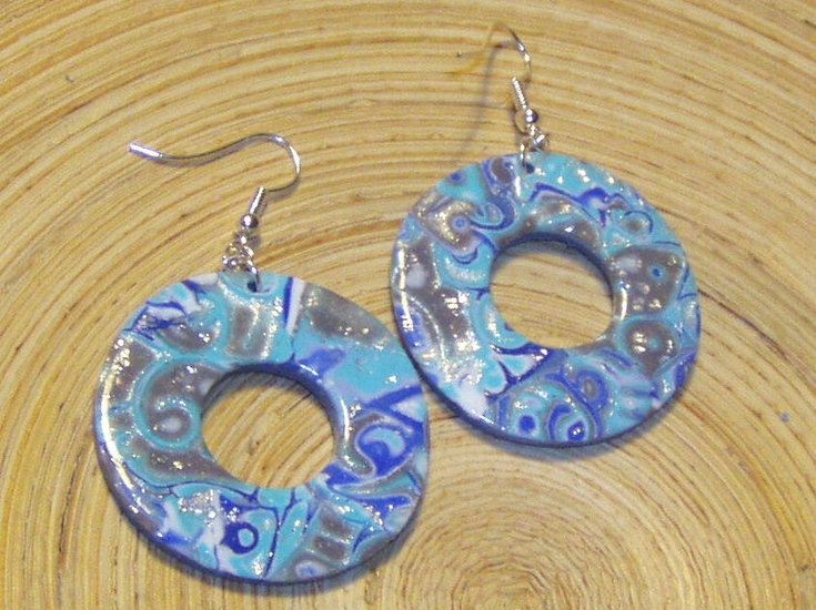 Oorbellen in Mokume cane techniek. Ronde hangers.