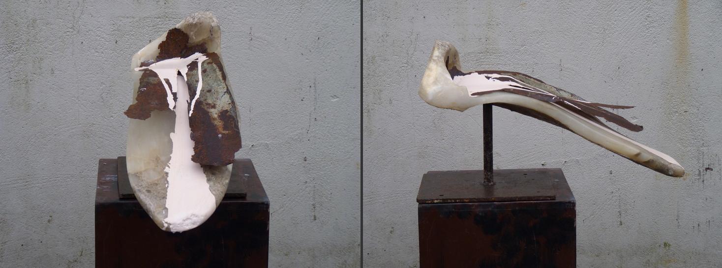 Witte albast, verroest metaal, verf. Geschikt voor plaatsing binnen.