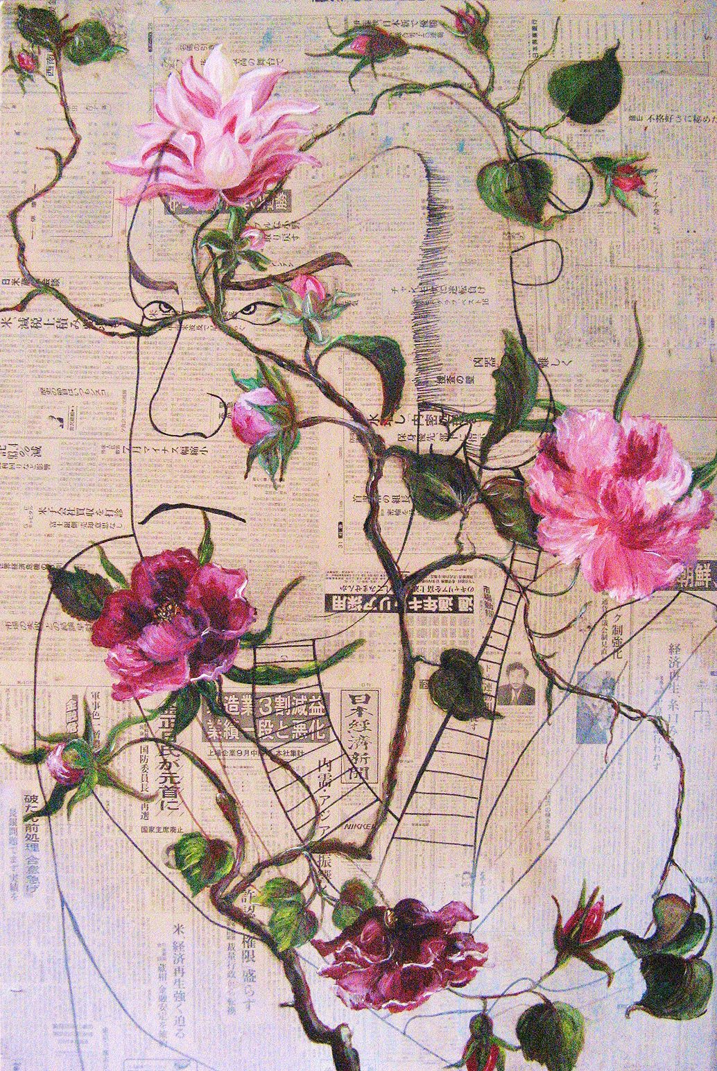 Een chinese blokprint op een chinese krant met daaroverheen een ranke voorstelling van rose rozen.