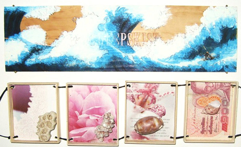 Een herinnering aan een bezoek aan exotische oorden ,schelpen en stenen. Schelpen en koraal uit Azie en Australie vormen samen met een zeegezicht geinspireerd op werk van Hiroshige een passend souvenir.