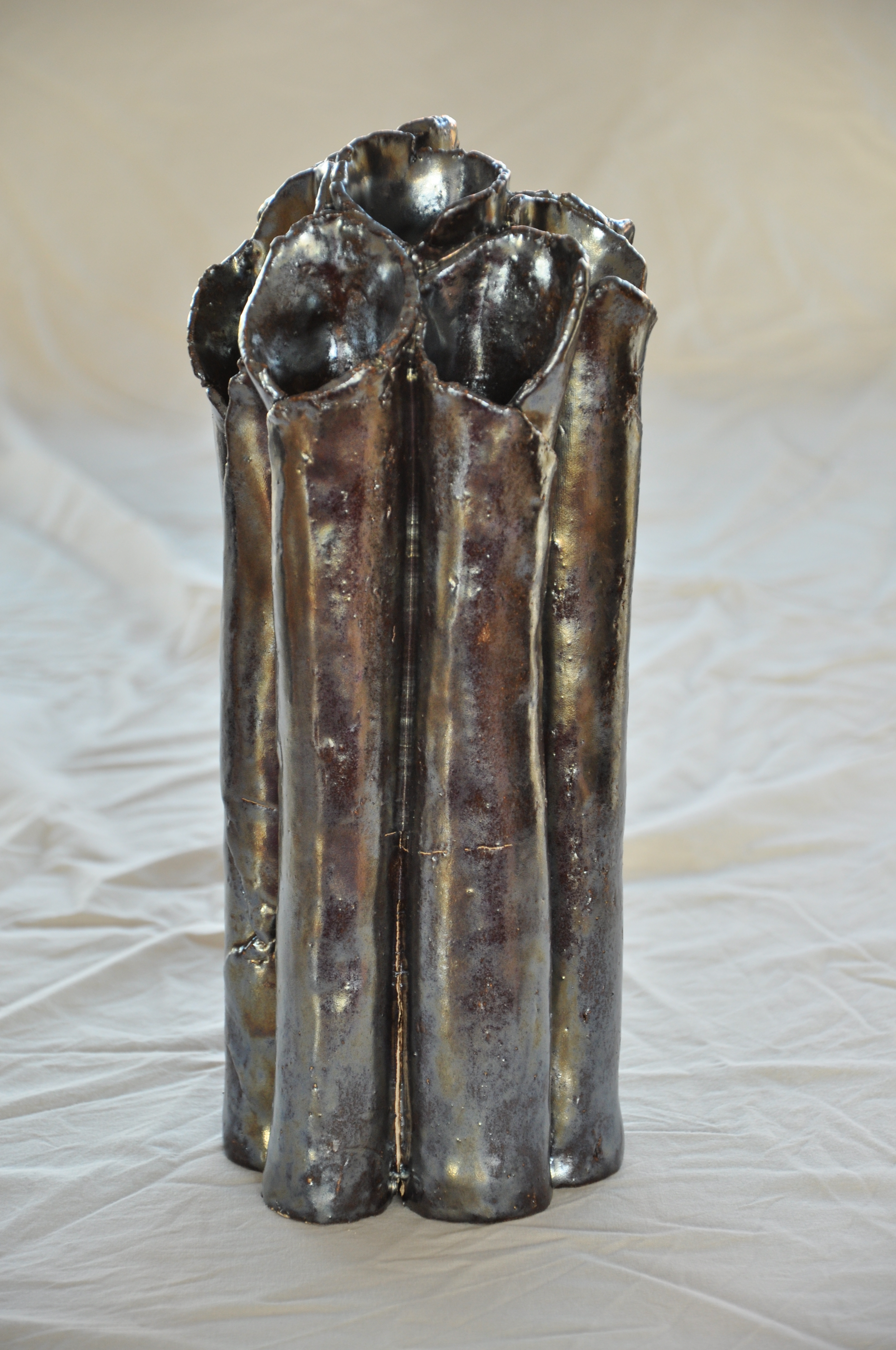 Deze tulpenvaas met vele tuiten is zeer decoratief bij het gebruik van enkele bloemen. Het glazuur is olie-achtig en afhankelijk van de belichting is het bruin of goudkleurig.