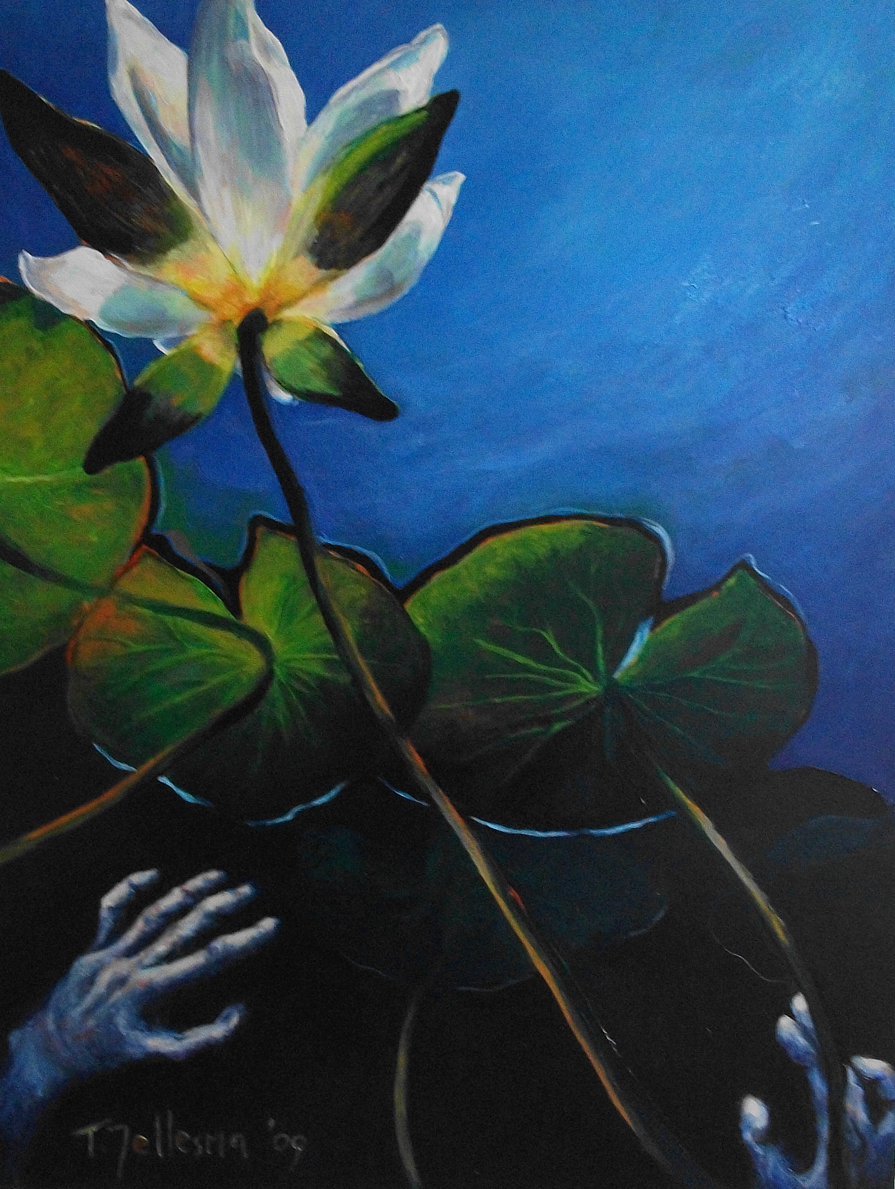 Om een schildering van een waterlelie, gezien van onderaf, spannender te maken heb ik handen toegevoegd die omhoogreiken; naar de lucht en de vrijheid te kunnen ademen.