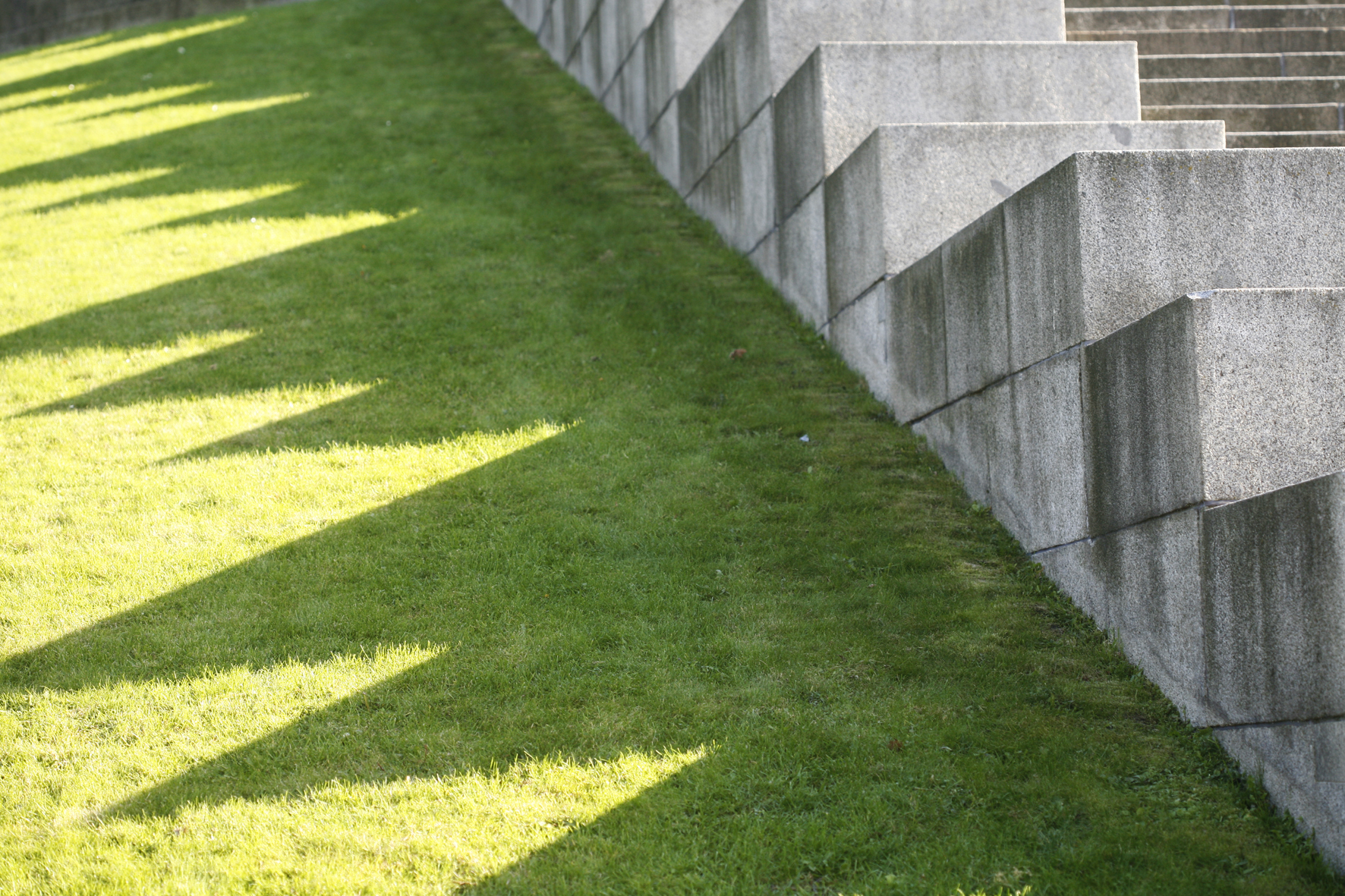 de lange schaduw van de trap tekent een mooi lijnenspel op het groene gazon