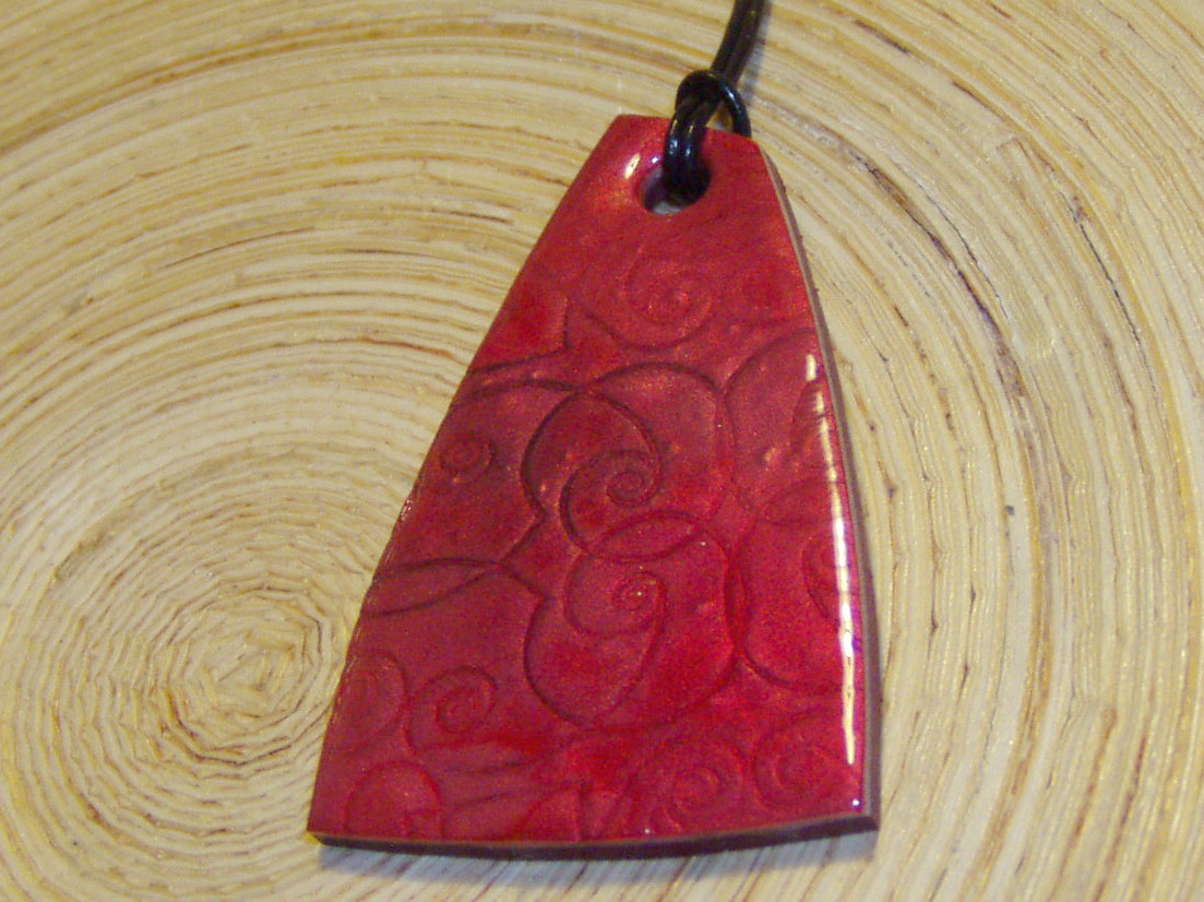 Rode metalic parelmoer hanger in langwerpige vorm aan een dunne zwarte ketting.