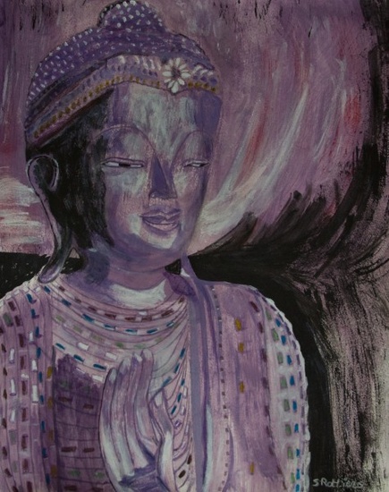 Boedha met hand omhoog wat tegenspoed voorkomt Acryl op papier 50 cm x 40 cm