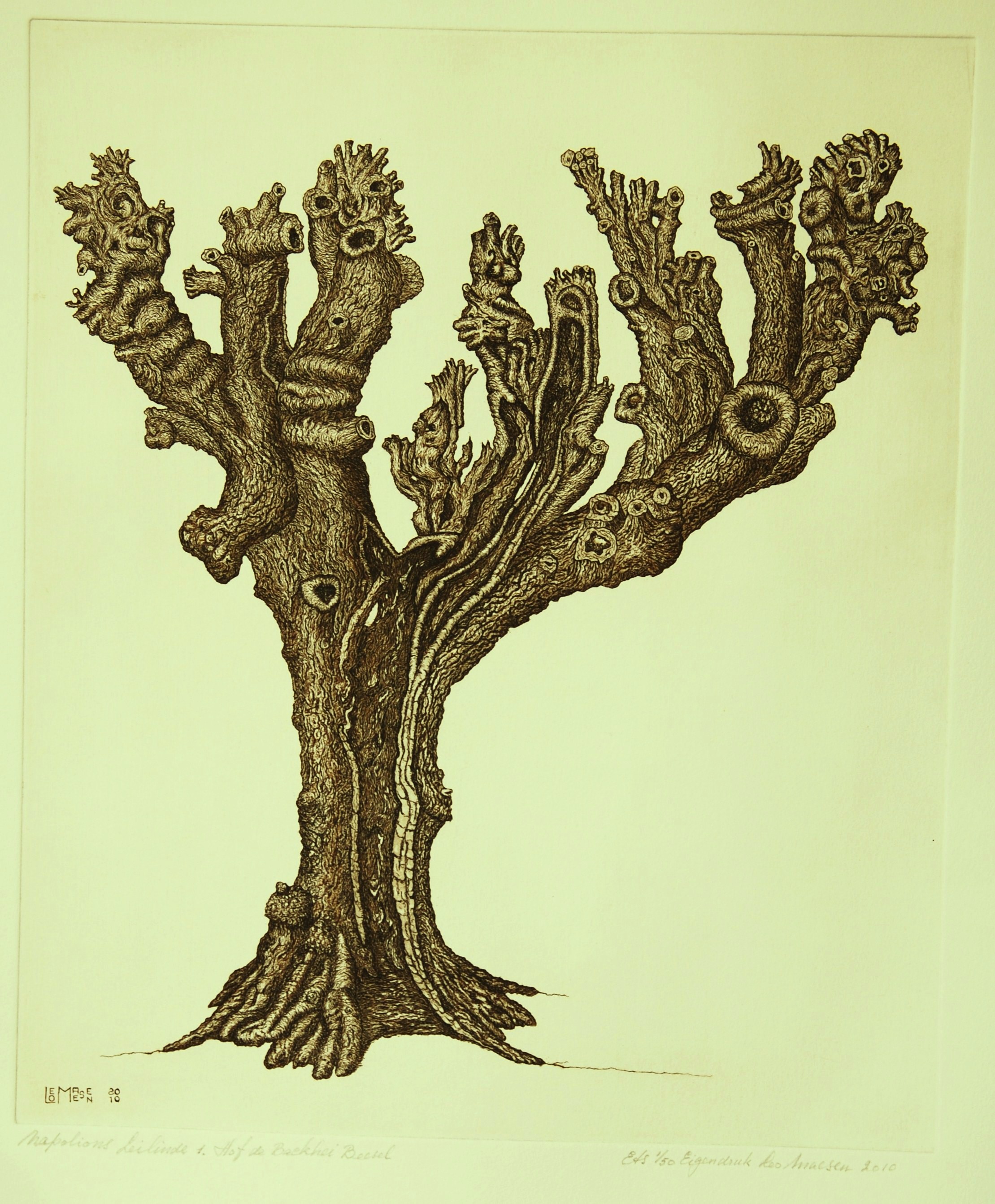 Een meer dan 200 jaar oude leilinde bij een evenoud boerderijtje in Midden Limburg gem. Beesel Door het honderde jaren knotten van de boom zijn er prachtige vormen ontstaan die de inspiratie voor mij waren om deze ets te maken. in zomerdag beschermd de leilinde het boerderijtje tegen het felle zonlicht en in de winter laat hij de mensen die het willen zien genieten van zijn prachtige vormen.