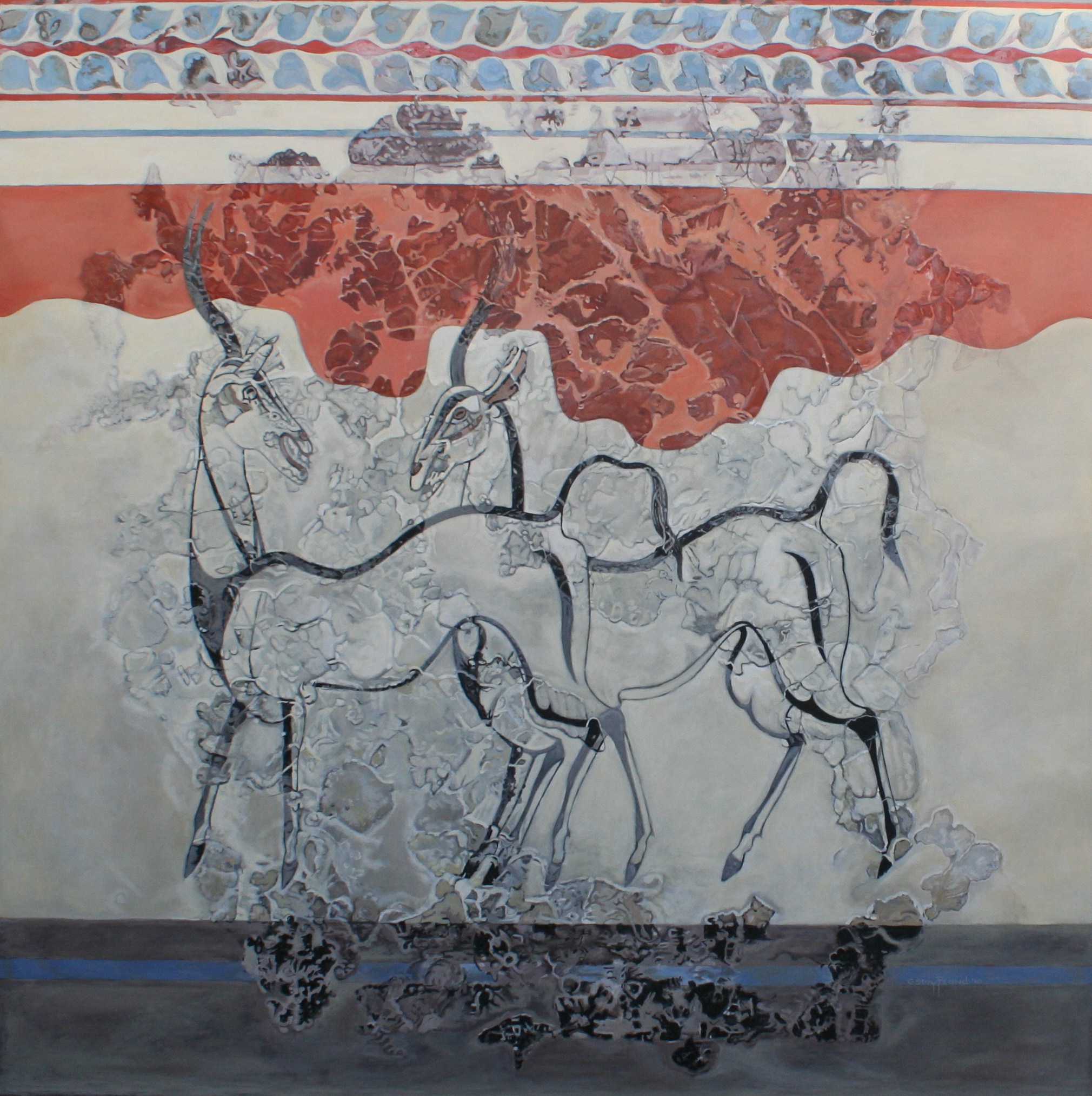 Realistisch Olieverf Griekenland Santorini Fresco Antilopen Akrotiri Grijs Zwart Terra Rood Gerestaureerd